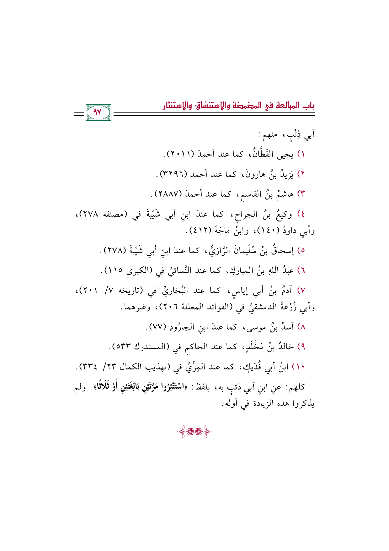 كلهم: عنِ ابنِ أبي ذئبٍ به، بلفظ: «اسْتَنْثِرُوا مَرَّتَيْنِ بَالِغَتَيْنِ أَوْ ثَلَاثًا». ولم يذكروا هذه الزيادة في أوله.