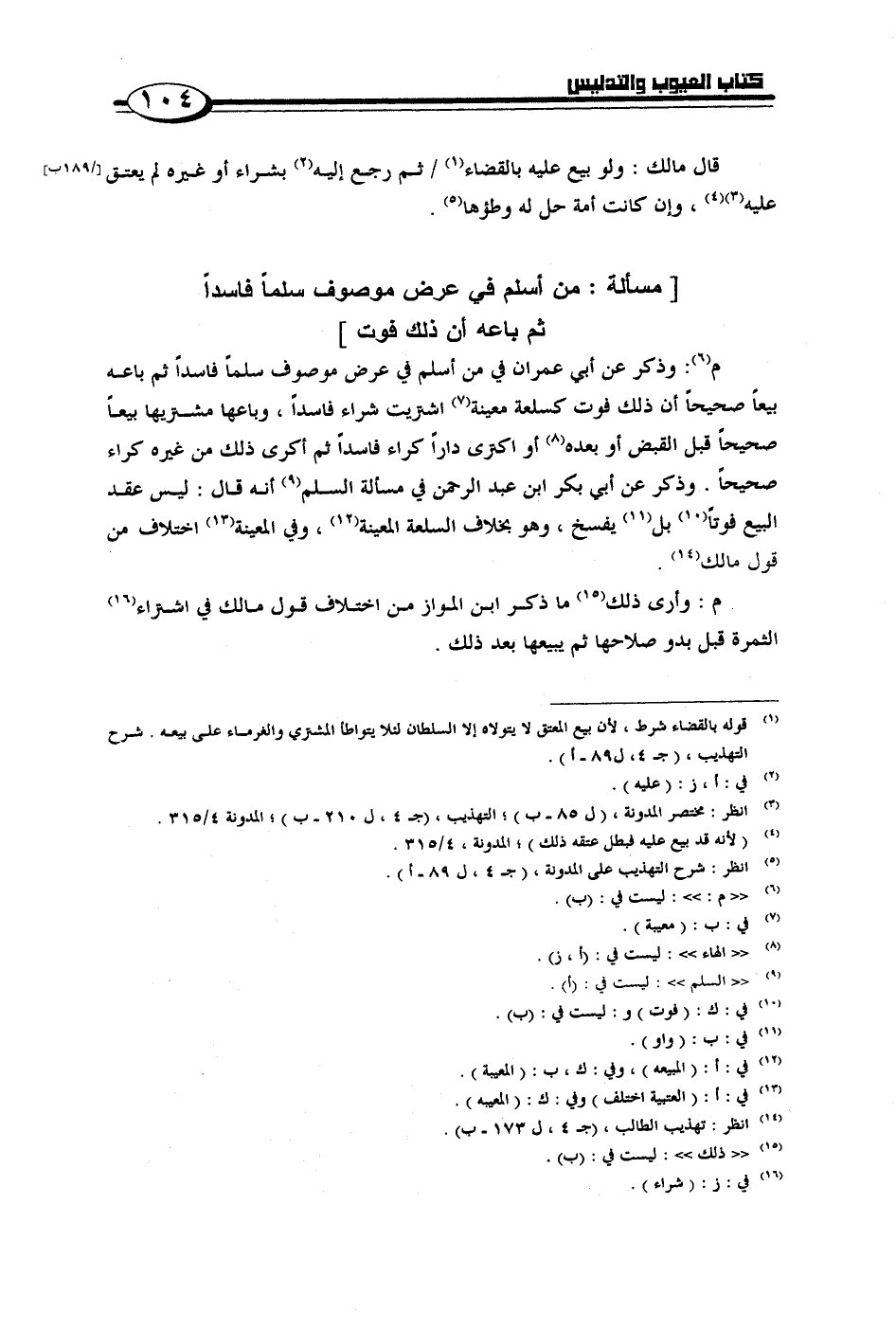 م: وذكر عن أبي عمران في من أسلم في عرض موصوف سلماً فاسداً ثم باعه بيعاً صحيحاً أن ذلك فوت كسلعة معينة اشتريت شراء فاسداً, وباعها مشتريها بيعاً صحيحاً قبل القبض أو بعده أو اكترى دراً كراء فاسداً ثم أكرى ذلك من غير كراء صحيحاً. وذكر عن أبي بكر ابن عبد الرحمن في مسألة السلم أنه قال: ليس عقد البيع فوتاً بل يفسخ, وهو بخلاف السلعة المعينة, وفي المعينة اختلاف من قول مالك.