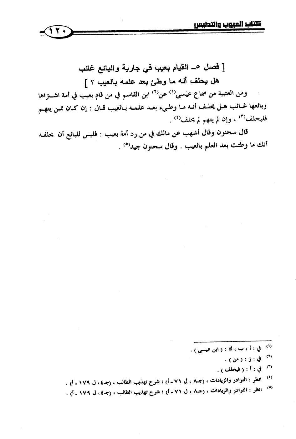 ومن العتبية من سماع عيسى عن ابن القاسم في من قام بعيب في أمة اشتراها وبائعها هل يحلف أنه ما وطئ بعد علمه بالعيب قال: إن كان ممن يتهم فليحلف, وإن لم يتهم لم يحلف.