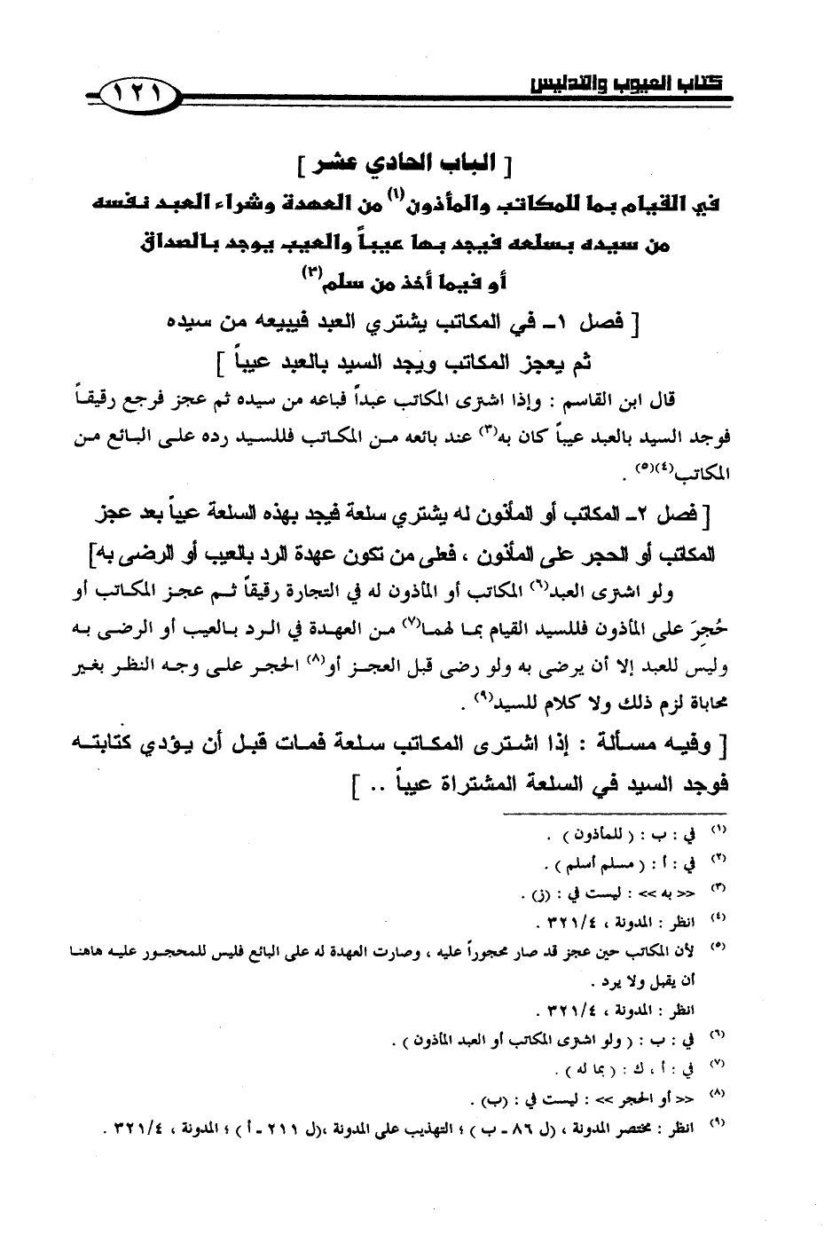 [فصل 2 - المكاتب أو المأذون له يشتري سلعة فيجد بهذه السلعة عيباً بعد عجز المكاتب أو الحجر على المأذون, فعلى من تكون عهدة الرد والعيب أو الرضى به]
