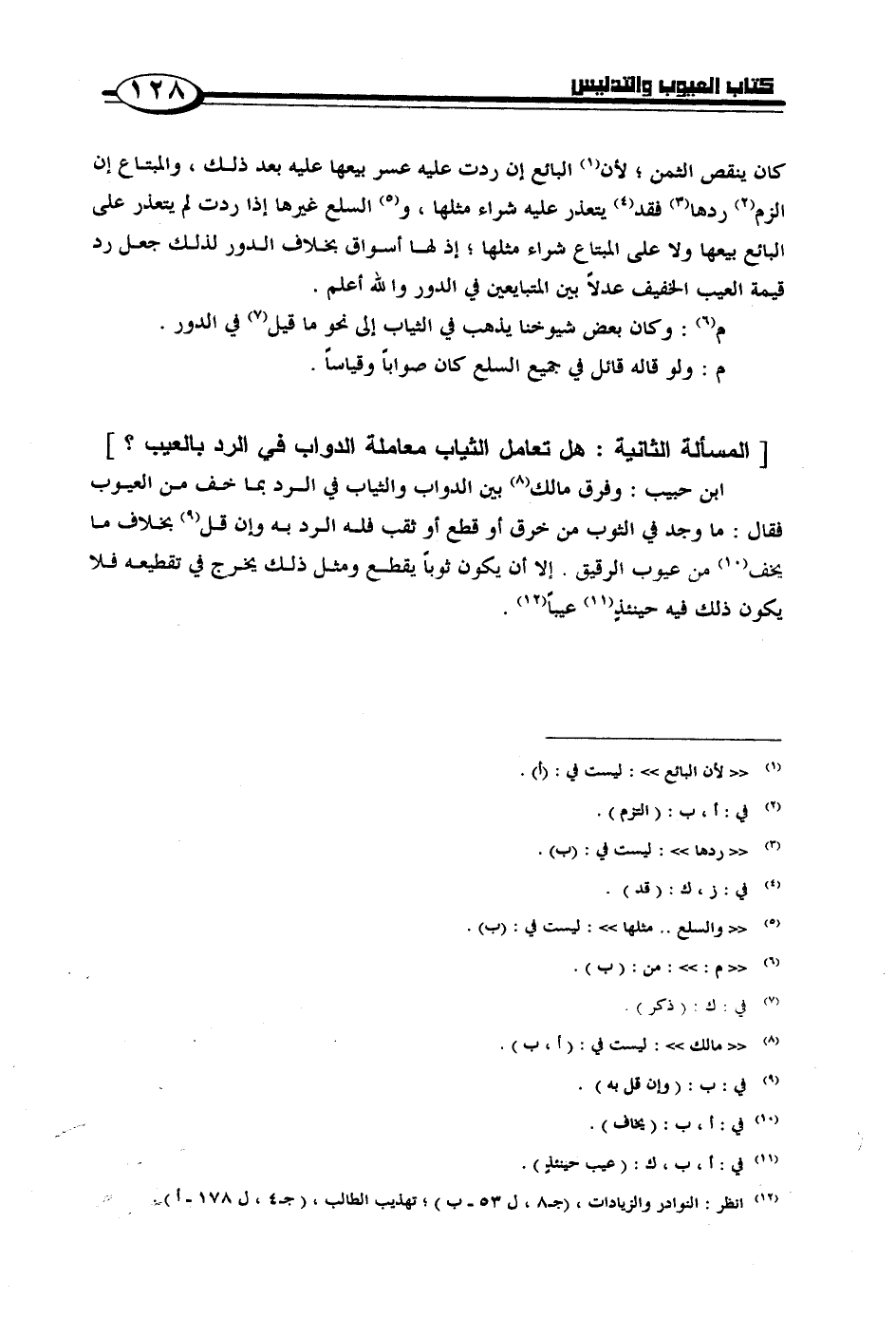 ابن حبيب: وفرق مالك بين الدواب والثياب في الرد بما خف من العيوب فقال: ما وجد في الثوب من خرق أو قطع أو ثقب فله الرد به وإن قل بخلاف ما يخف من عيوب الرقيق. إلا أن يكون ثوباً يقطع ومثل ذلك يخرج في تقطيعه فلا يكون ذلك فيه حينئذٍ عيباً.