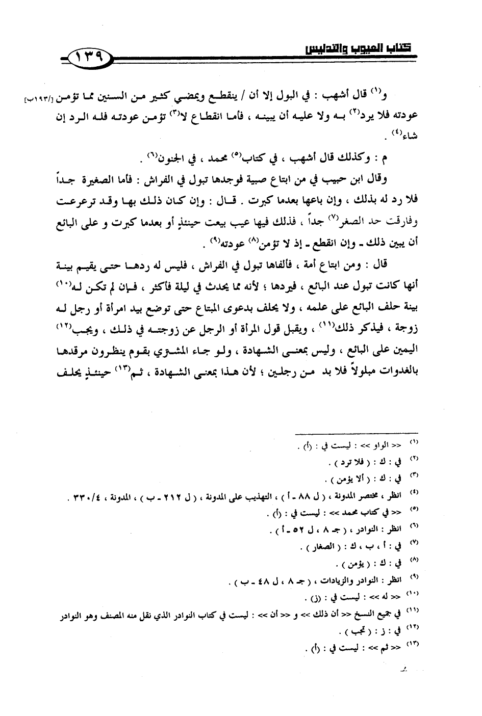 وقال ابن حبيب في من ابتاع صبية فوجدها تبول في الفراش: فأما الصغيرة جداً فلا رد له بذلك, وإن باعها بعدما كبرت. قال: وإن كان ذلك بها وقد ترعرعت وفارقت حد الصغر جداً, فذلك فيها عيب بيعت حينئذٍ أو بعدما كبرت وعلى البائع أن يبين ذلك -وإن انقطع- إذ لا تؤمن عودته.