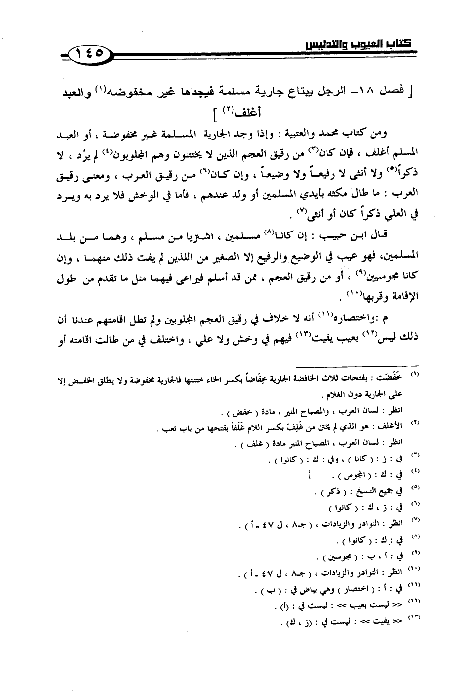 ومن كتاب محمد والعتيبة: وإذا وجد الجارية المسلمة غير مخفوضة، أو العبد المسلم أغلف، فإن كان من رقيق العجم الذين لا يختنون وهم المجلوبون لم يرد، لا ذكرًا ولا أنثى لا رفيعًا ولا وضيعًا، وإن كان من رقيق العرب، ومعنى رقيق العرب: ما طال مكثه بأيدي المسلمين أو ولد عندهم، فأما في الوحش فلا يرد به ويرد في العلي ذكرًا كان أو أنثى.