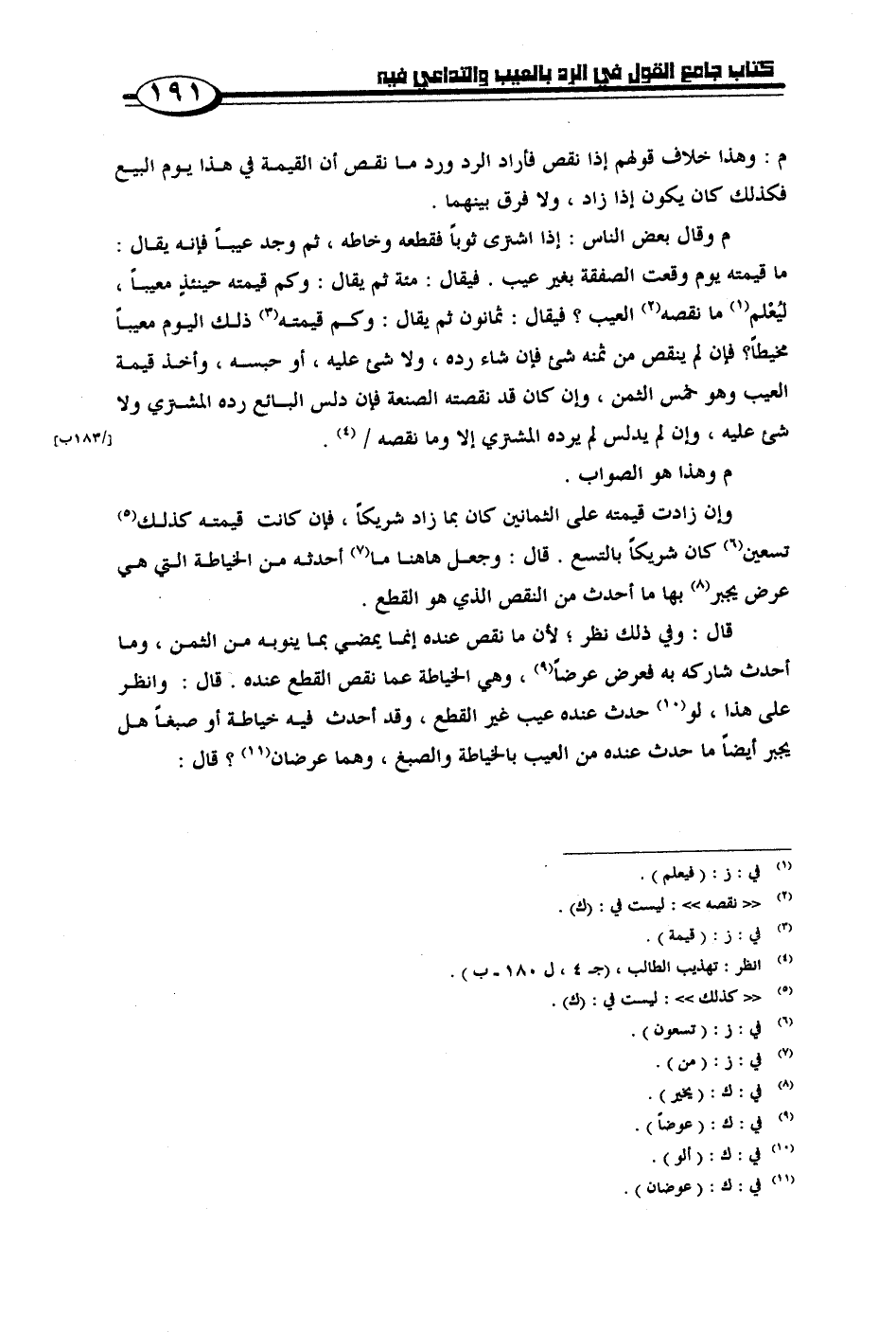 قال: وفي ذلك نظر؛ لأن ما نقص عنده إنما يمضي بما ينوبه من الثمن، وما أحدث شاركه به فعرض عرضًا، وهي الخياطة عما نقص القطع عنده. قال: وانظر على هذا، لو حدث عنده عيب غير القطع، وقد أحدث فيه خياطة أو صبغًا هل يجبر أيضًا ما حدث عنده من العيب بالخياطة والصبغ، وهما عرضان؟ قال: