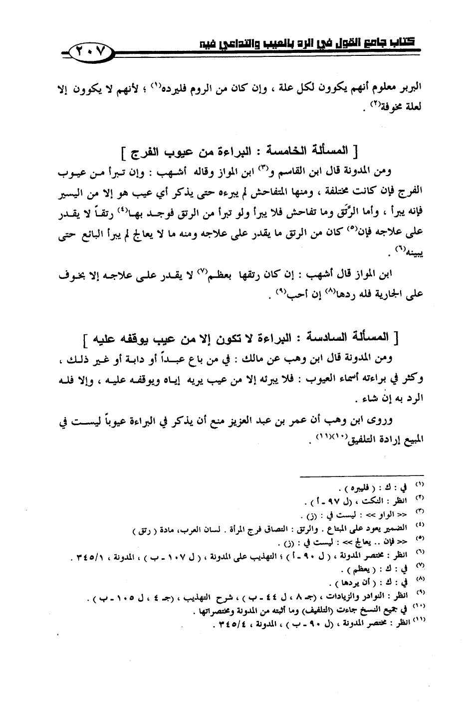 ومن المدونة قال ابن القاسم وابن المواز وقاله أشهب: وإن تبرأ من عيوب الفرج فإن كانت مختلفة، ومنها المتفاحش لم يبرءه حتى يذكر أي عيب هو إلا من اليسير فإن كانت مختلفة، ومنها التفاح لم يبرءه حتى يذكر أي عيب هو إلا من اليسير فلا يبرأ، وأما الرتق وما تفاحش فلا يبرأ ولو تبرأ من الرتق فوجد بها رتقاً لا يقدر على فإن كان الرتق ما يقدر على علاجه ومنه ما لا يعالج لم يبرأ البائع حتى يبينه.