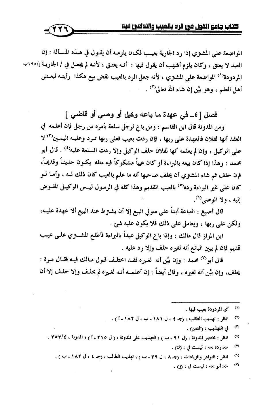المواضعة على المشتري إذا رد الجارية بعيب فكان يلزمه أن يقول في هذه المسألة: إن العبد لا يعتق، وكان يلزم أشهب أن يقول فيها: أنه يعتق؛ لأنه لم يجعل في الجارية/ المردودة المواضعة على المشتري، لأنه جعل الرد بالعيب نقض بيع هكذا رأيته لبعض أهل العلم، وهو بين إن شاء الله تعالى.