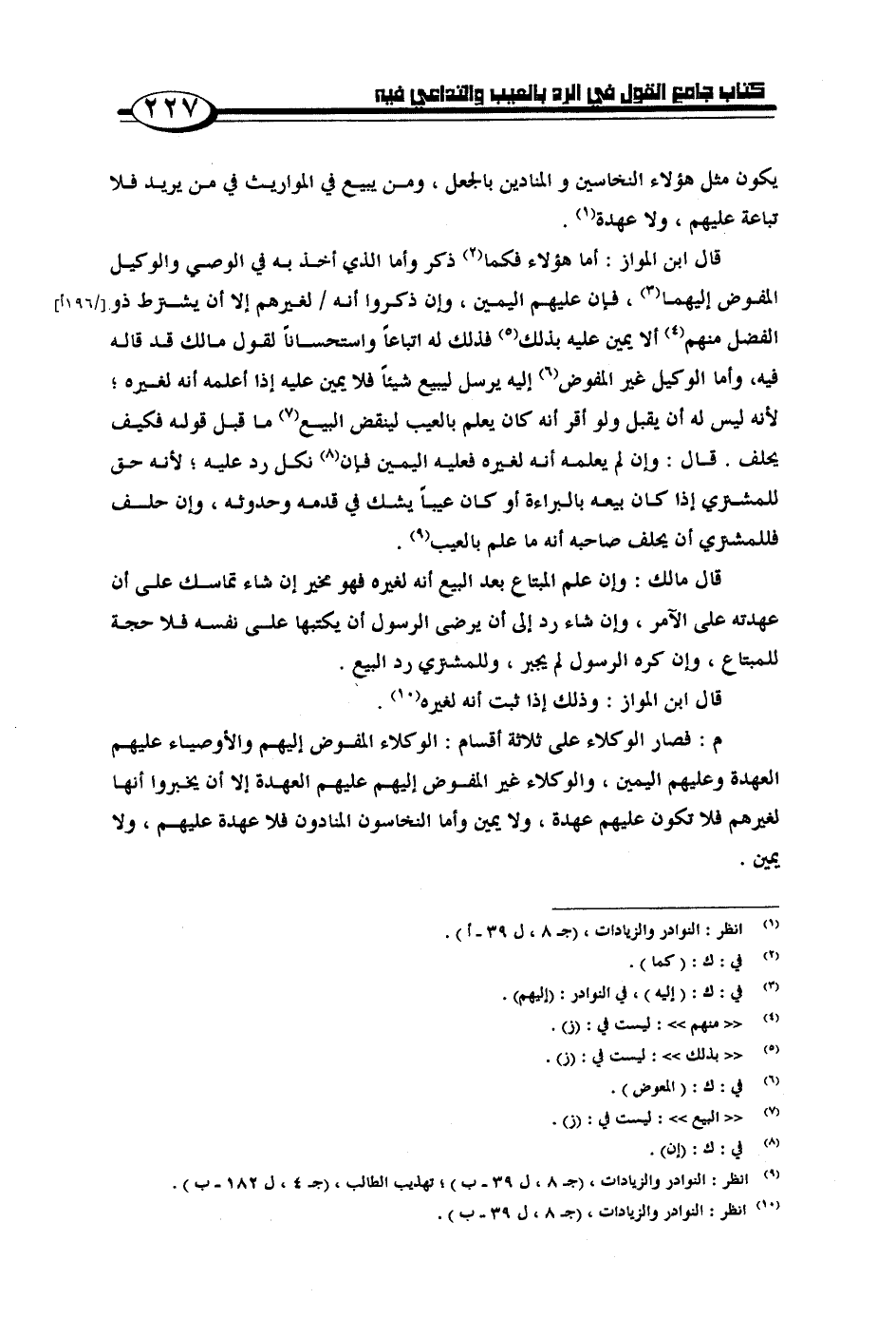 م: فصار الوكلاء على ثلاثة أقسام: الوكلاء المفوض إليهم والأوصياء عليهم العهدة وعليهم اليمين، والوكلاء غير المفوض إليهم عليهم العهدة إلا أن يخبروا أنها لغيرهم فلا تكون عليهم عهدة، ولا يمين وأما النخاسون المنادون فلا عهدة عليهم، ولا يمين.