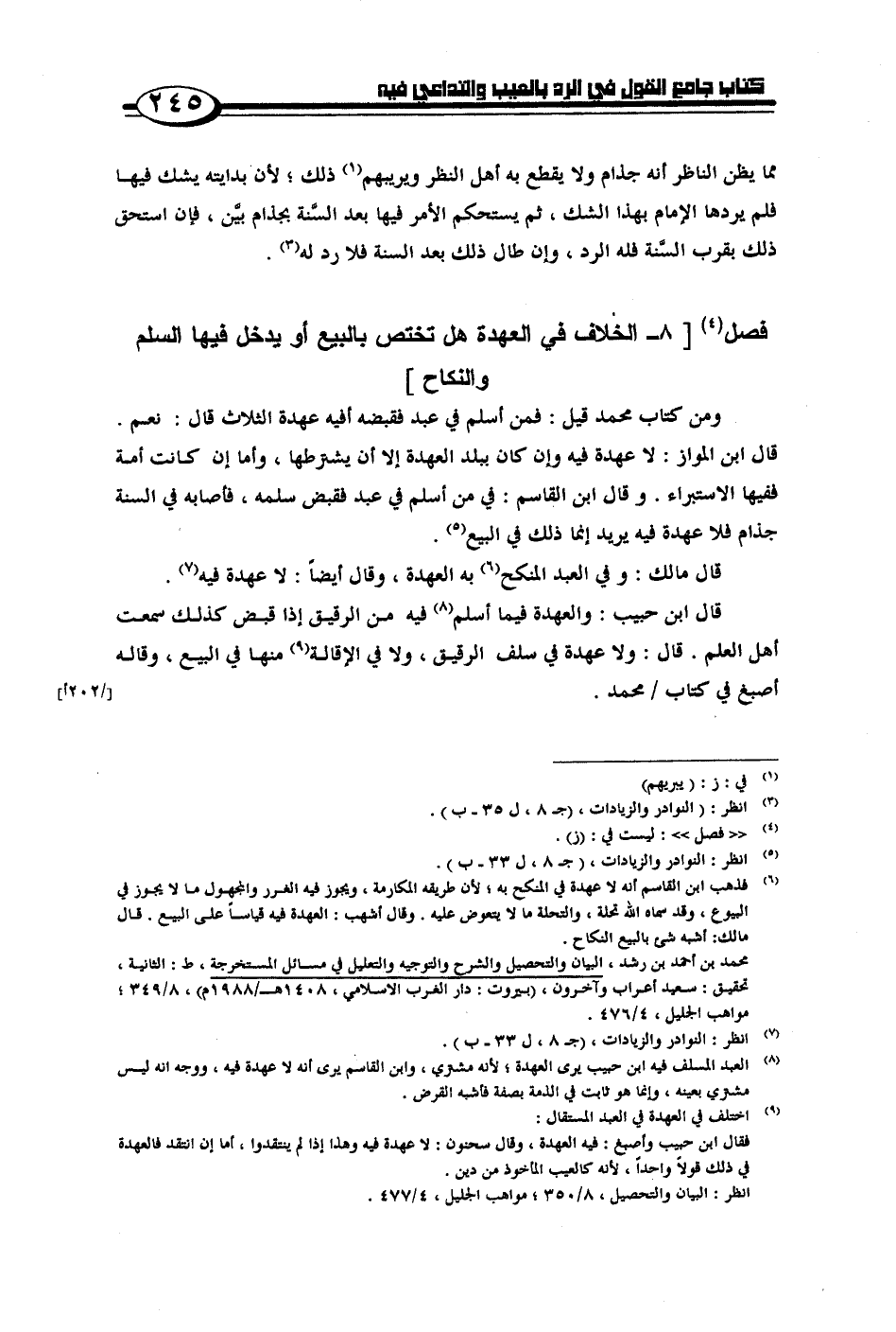 قال ابن حبيب: والعهدة فيما أسلم فيه من الرقيق إذا قبض كذلك سمعت أهل العلم. قال: ولا عهدة في سلف الرقيق، ولا في الإقالة منها في البيع، وقال أصبغ في كتاب/ محمد.