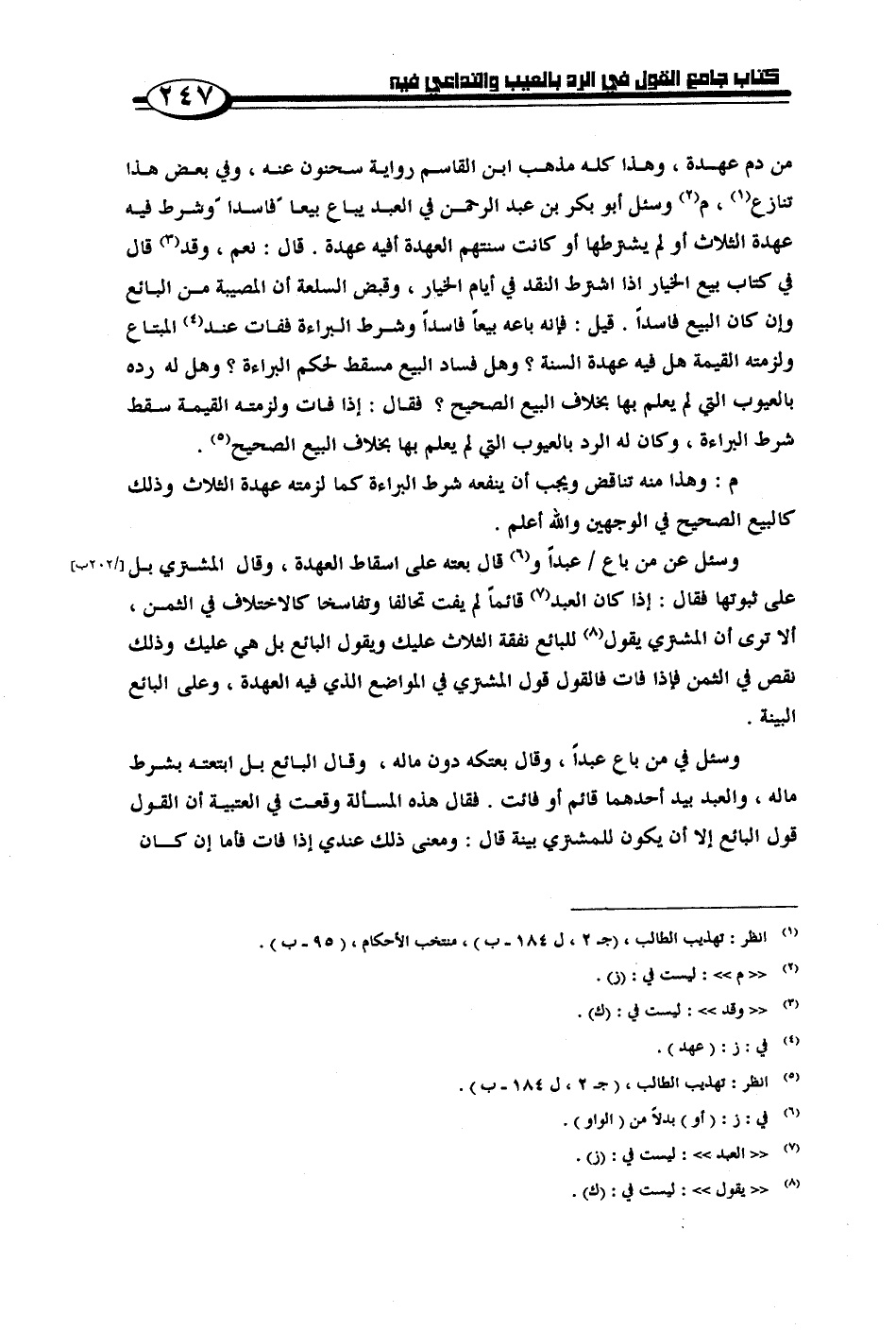 من دم عهدة، وهذا كله مذهب ابن القاسم رواية سحنون عنه، وفي بعض هذا تنازع، م وسئل أبو بكر بن عبد الرحمن في العبد يباع بيعاً فاسداً وشرط فيه عهدة الثلاث أو لم يشترطها أو كانت سنتهم العهدة أفيه عهدة؟ قال: نعم، وقد قال في كتاب بيع الخيار إذا اشترط النقد في أيام الخيار، وقبض السلعة أن المصيبة من البائع وإن كان البيع فاسداً.