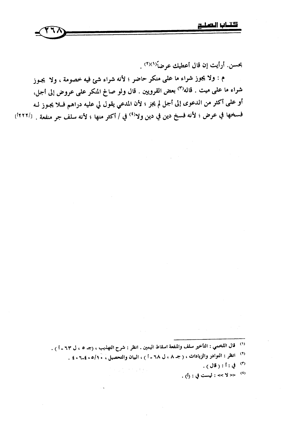 قال ولو صالح المنكر على عروض إلى أجل، أو على أكثر من الدعوى إلى أجل لم يجز؛ لأن المدعي يقول لي عليه دراهم فلا يجوز له فسخه في عرض؛ لأنه فسخ دين في دين ولا في/أكثر منها؛ لأنه سلف جر منفعة.