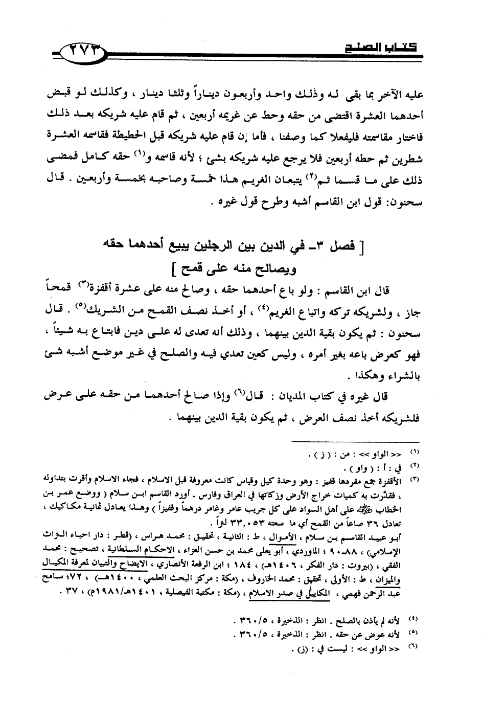 قال ابن القاسم: ولو باع أحدهما حقه، وصالح منه على عشرة أقفزة قمحاً جاز، ولشريكه تركه واتباع الغريم، أو أخذ نصف القمح من الشريك.