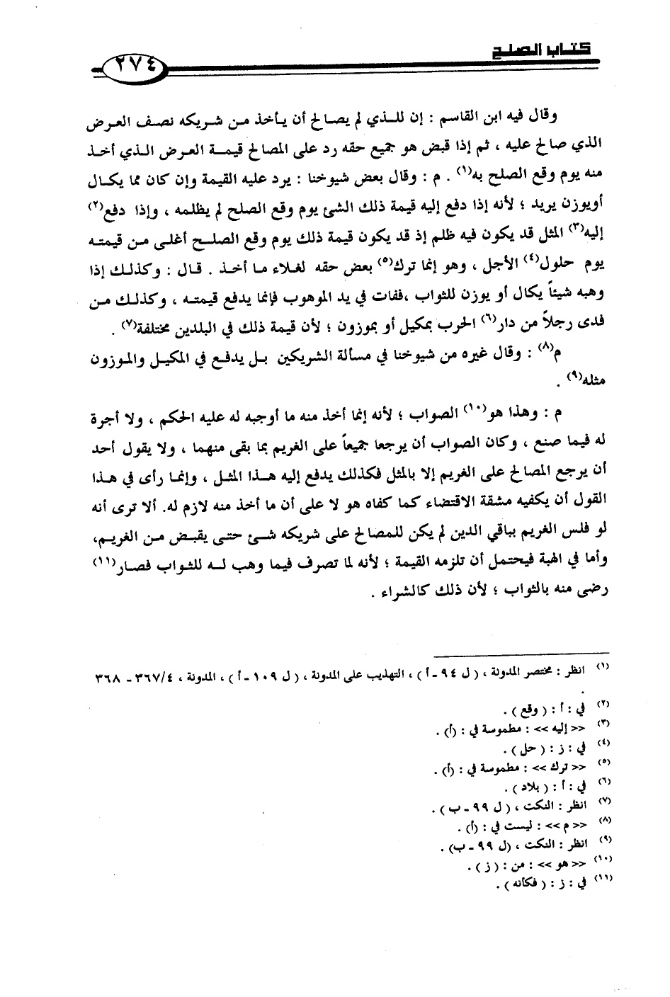 م: وهذا هو الصواب؛ لأنه إنما أخذ منه ما أوجبه له عليه الحكم، ولا أجرة له فيما صنع، وكان الصواب أن يرجعا جميعاً على الغريم بما بقى منهما، ولا يقول أحد أن يرجع المصالح على الغريم إلا بالمثل فكذلك يدفع إليه هذا المثل، وإنما رأى في هذا القول أن يكفيه مشقة الاقتضاء كم كفاه هو لا على أن ما أخذ منه لازم له. ألا ترى أنه لو أفلس الغريم بباقي الدين لم يكن للمصالح على شريكه شيء حتى يقبض من الغريم، وأما في الهبة فيتحمل أن تلزمه القيمة؛ لأنه لما تصرف فيما وهب له للثواب فصار رضى منه بالثواب؛ لأن ذلك كالشراء.