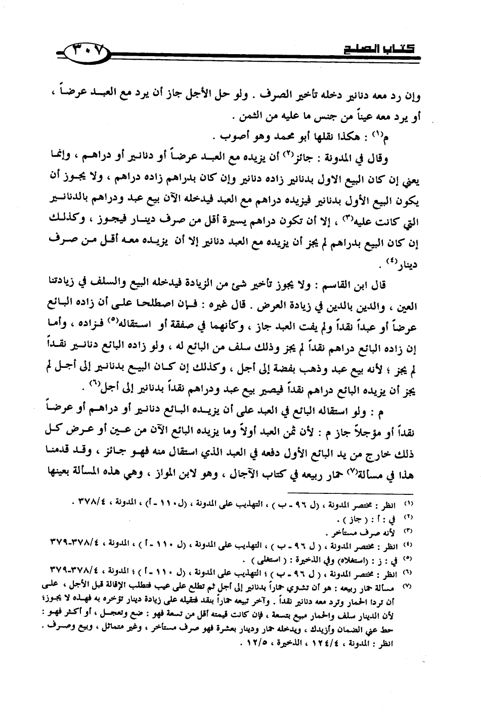 قال ابن القاسم: ولا يجوز تأخير شيء من الزيادة فيدخله البيع والسلف في زيادتنا العين، والدين بالدين في زيادة العرض. قال غيره: فإن اصطلحا على أن زاده البائع عرضاً أو عبداً نقداً ولم يفت العبد جاز، وكأنهما في صفقة أو استقالة فزاده، وأما إن زاده البائع دراهم نقداً لم يجز وذلك سلف من البائع له، ولو زاده البائع دنانير نقداً لم يجز؛ لأنه بيع عبد وذهب بفضة إلى أجل، وكذلك إن كان البيع بدنانير إلى أجل لم يجز أن يزيده البائع دراهم نقداً فيصير بيع عبد ودراهم نقداً بدنانير إلى أجل.