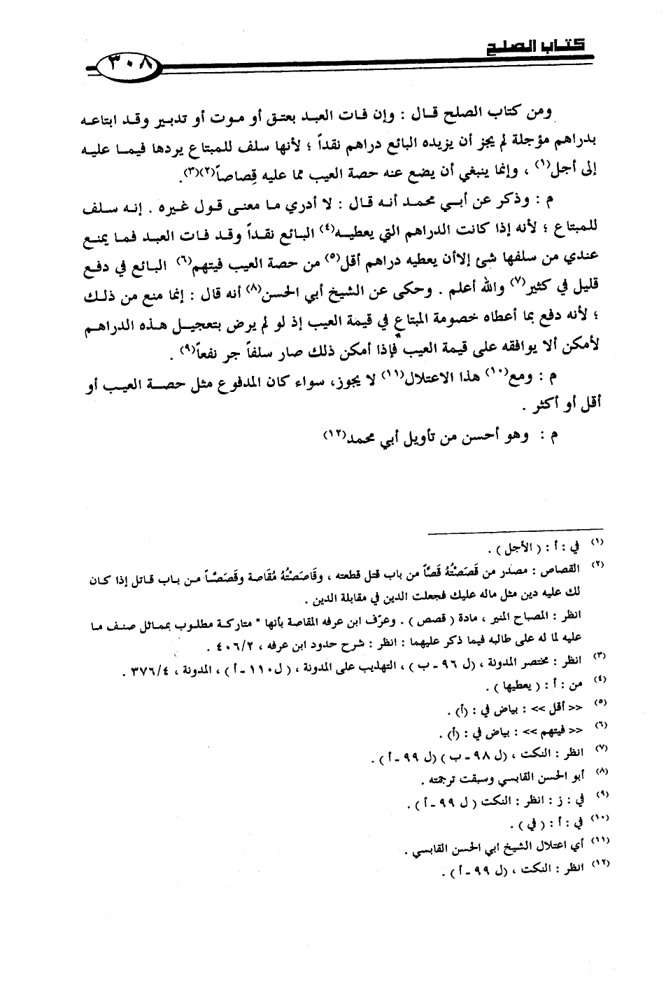 م: وذكر عن أبي محمد أنه قال: لا أدري ما معنى قول غيره. إنه سلف للمبتاع؛ لأنه إذا كانت الدراهم التي يعطيه البائع نقداً وقد فات العبد فما يمنع عندي من سلفها شيء إلا أن يعطيه دراهم أقل من حصة العيب فيتهم البائع في دفع قليل في كثير والله أعلم. وحكي عن الشيخ أبي الحسن أنه قال: إنما منع من ذلك؛ لأنه دفع بما أعطاه خصومة المبتاع في قيمة العيب إذ لو لم يرض بتعجيل هذه الدراهم لأمكن ألا يوافقه على قيمة العيب فإذا أمكن ذلك صار سلفاً جر نفعاً.