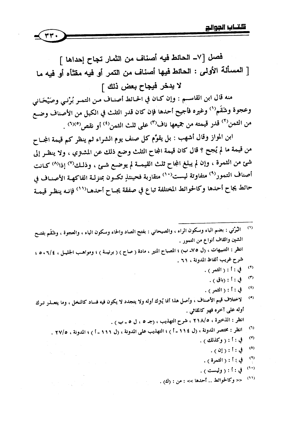 ابن المواز وقال أشهب: بل يقوَّم كل صنف يوم الشراء ثم ينظر كم قيمة المجاح من قيمة ما لم يُجح؟ قال كان قيمة المجاح الثلث وضع ذلك عن المشتري، ولا ينظر إلى شيء من الثمرة، وإن لم يبلغ المجاح ثلث القيمة لم يوضع شيء، وذلك إذا كانت أصناف التمور متفاوتة ليست متقاربة فحينئذٍ تكون بمنزلة الفاكهة الأصناف في حائط يجاح أحدها وكالحوائط المختلفة تباع في صفقة يجاح أحدها فإنه ينظر قيمة