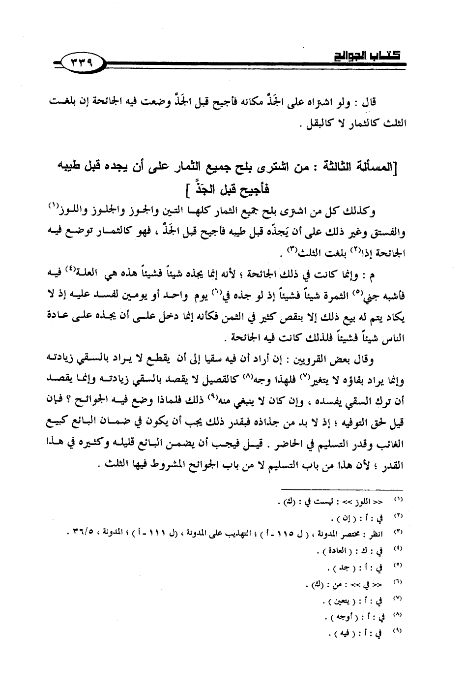 وقال بعض القرويين: إن أراد أن فيه سقيا إلى أن يقطع لا يراد بالسقي زيادته وإنما يراد بقاؤه لا يتغير فلهذا وجه كالقصيل لا يقصد بالسقي زيادته وإنما يقصد أن ترك السقي يفسده، وإن كان لا ينبغي منه ذلك فلماذا وضع فيه الجوائح؟ فإن قيل لحق التوفيه؛ إذ لا بد من جذاذة فبقدر ذلك يجب أن يكون في ضمان البائع كبيع الغائب وقدر التسليم في الحاضر. قيل فيجب أن يضمن البائع قليله وكثيرة في هذا القدر؛ لأن هذا من باب التسليم لا من باب الجوائح المشروط فيها الثلث.