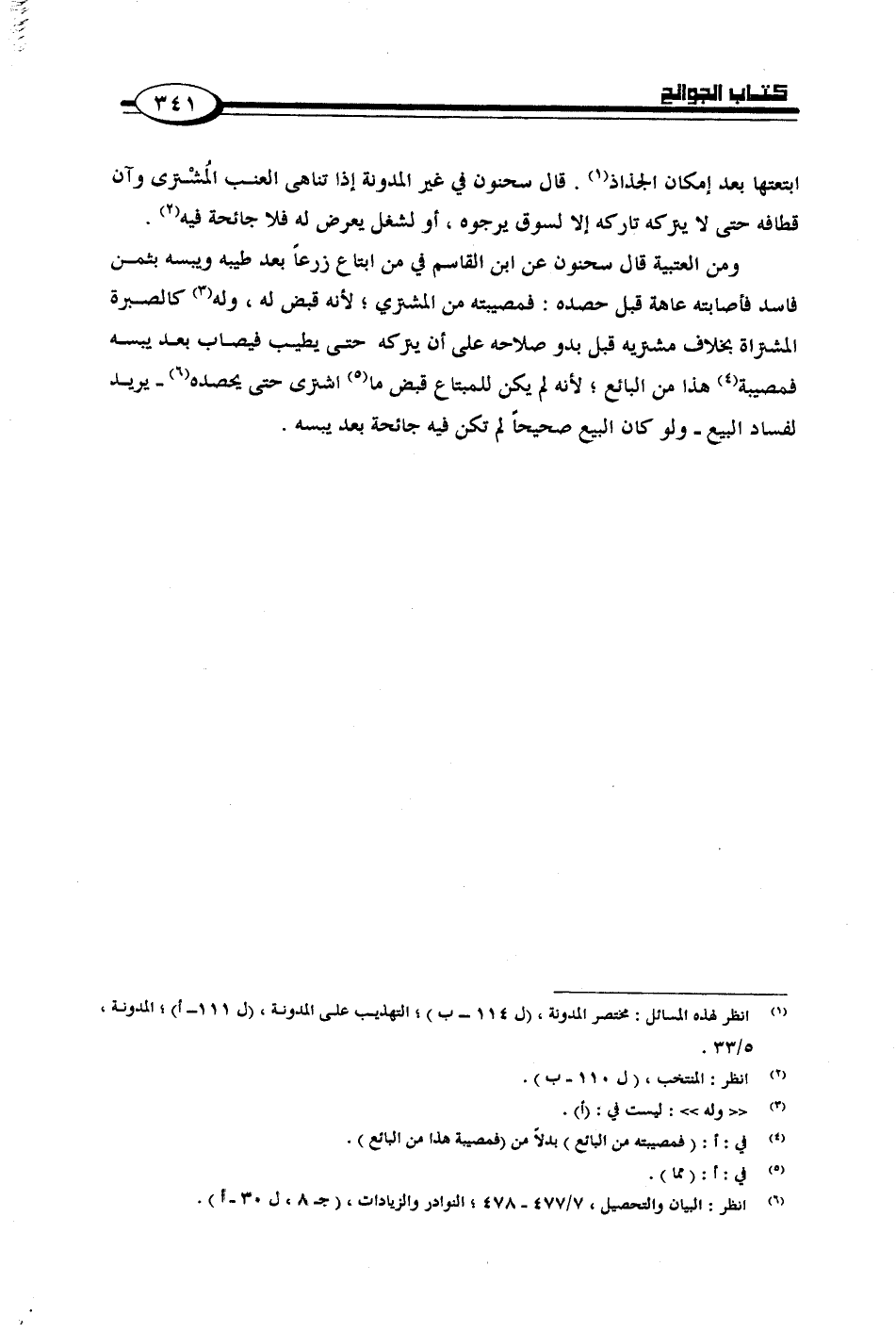 ابتعتها بعد إمكان الجذاذ. قال سحنون في غير المدونة إذا تناهى العنب الُمشْترى وآن قطافه حتى لا يتركه تاركه إلا لسوق يرجوه، أو لشغل يعرض له فلا جائحة فيه.