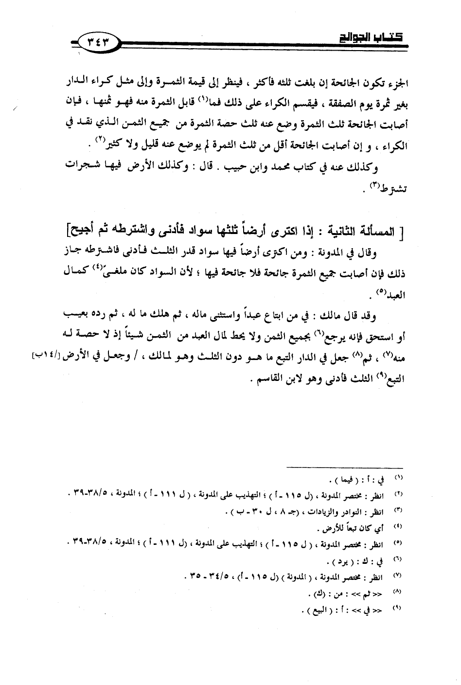 وقال في المدونة: ومن اكترى أرضاً فيها سواد قدر الثلث فأدنى فاشترطه جاز ذلك فإن أصابت جميع الثمرة جائحة فلا جائحة فيها؛ لأن السواد كان ملغىً كمال العبد.