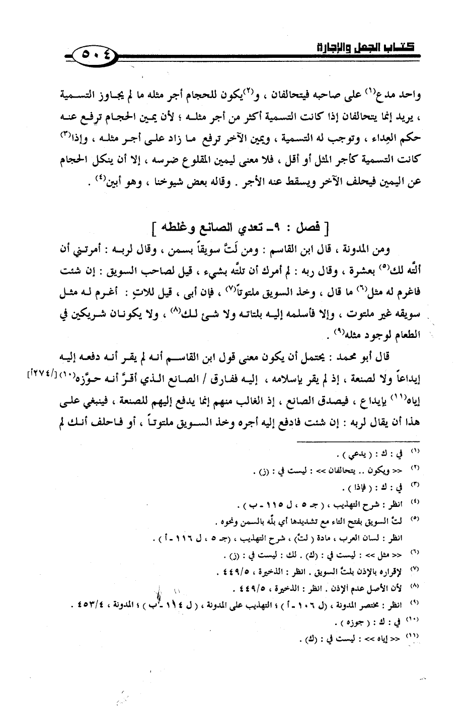 ومن المدونة: قال ابن القسام: ومن لَتَّ سويقاً بسمن, وقال لربه: أمرتني أن ألتَّه بعشرة, وقال ربه: لم أمرك أن تلتَّه بشيء, قيل لصاحب السويق: إن شئت فاغرم له مثل ما قال, وخذ السويق ملتوتاً, فإن أبى, قيل للاتِ: أغرم له مثل سويقه غير ملتوت, وإلا فأسلمه إليه بلتاته ولا شيء لك, ولا يكونان شريكين في الطعام لوجود مثله.