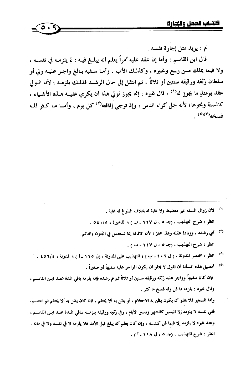 قال ابن القاسم: وأما إن عقد عليه أمراً يعلم أنه يبلغ فيه: لم يلزمه في نفسه, ولا فيما يملك من ربع وغيره, وكذلك الأب. وأما سفيه بالغ وأجر عليه ولي أو سلطان رَبْعَه ورقيقه سنتين أو ثلاثاً, ثم انتقل إلى حال الرشد فذلك يلزمه؛ لأن الولي عقد يومئذِ ما يجوز له, قال غيره: إنما يجوز لولي هذا أن يكري عليه هذه الأشياء, كالسنة ونحوها؛ لأنه جل كراء الناس, وإذ ترجي إفاقته كل يوم, وأما ما كثر فله فسخه.