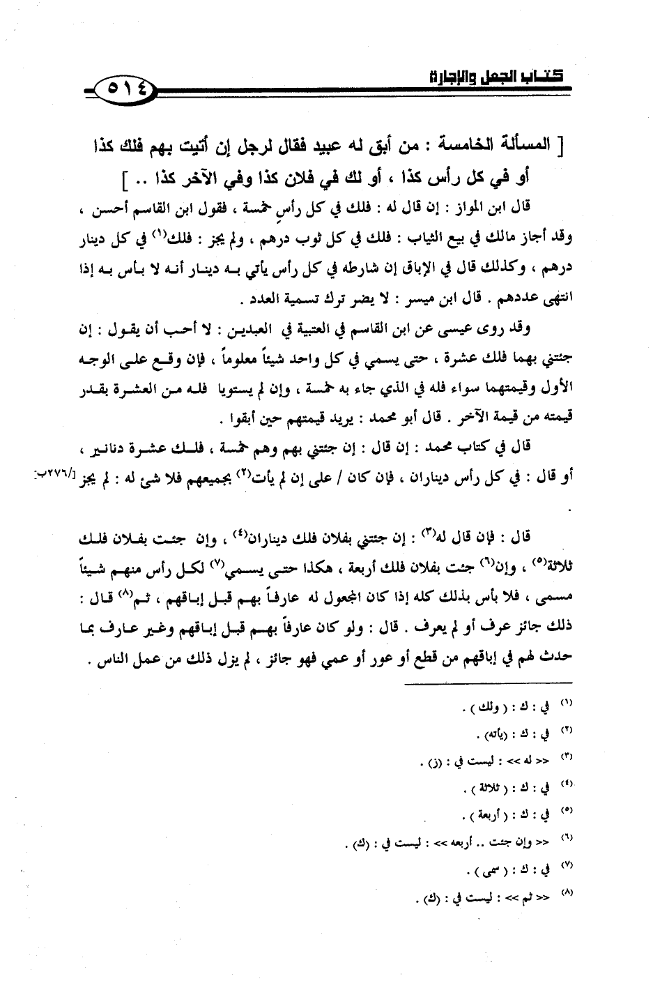 قال ابن المواز: إن قال له: فلك في كل رأسٍ خمسة, فقول ابن القاسم أحسن, وقد أجاز مالك في بيع الثياب: فلك في كل ثوب درهم, ولم يجز: فلك في كل دينار درهم, وكذلك قال في الإباق إن شارطه في كل رأس يأتي به دينار أنه لا بأس به إذا انتهى عددهم. قال ابن ميسر: لا يضر ترك تسمية العدد.