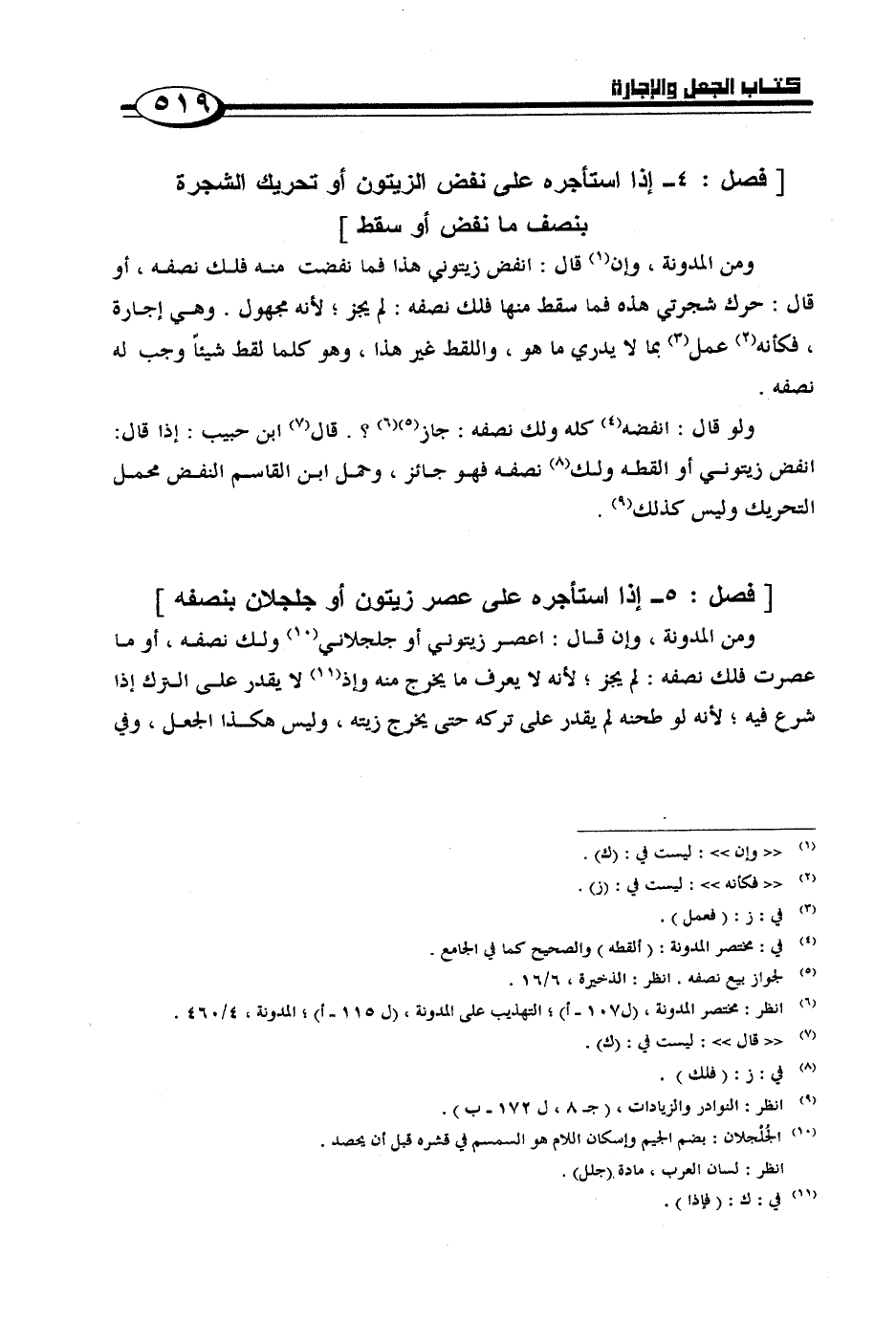 ومن المدونة, وإن قال: أعصر زيتوني أو جلجلاني ولك نصفه, أو ما عصرت فلك نصفه: لم يجز؛ لأنه لا يعرف ما يخرج منه وإذا لا يقدر على الترك إذا شرع فيه؛ لأنه لو طحنه لم يقدر على تركه حتى يخرج زيته, وليس هكذا الجعل, وفي