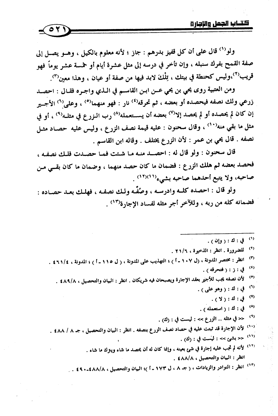 ومن العتبية روى يحيى بن يحيى عن ابن القاسم في الذي واجره فقال احصد زرعي ولك نصفه فيحصده أو بعضه, ثم تحرقه نار: فهو منهما, وعلى الأجير إن كان لم يحصده أو لم يحصد إلا بعضه أن يستعمله رب الزرع في مثله, أو في مثل ما بقي منه, وقال سحنون: عليه قيمة نصف الزرع, وليس عليه حصاد مثل نصفه. قال يحيى بن عمر: لأن الزرع يختلف. وقاله ابن القاسم.