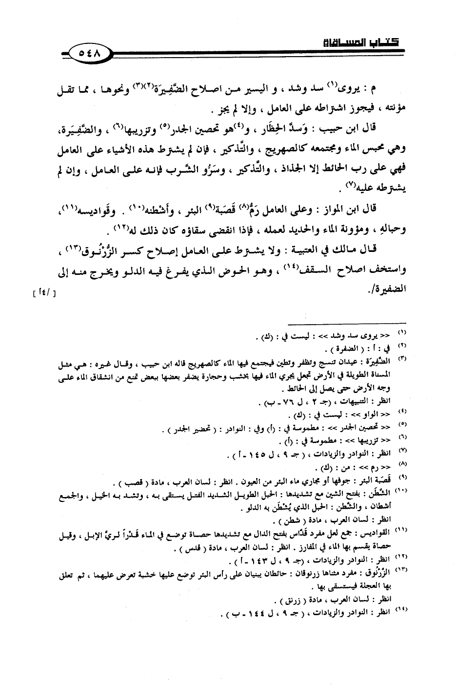 قال ابن حبيب: وَسدَّ الحِظَار, وهو تحصين الجدر وتزريبها, والضَّفِيَرة, وهي محبس الماء ومجتمعه كالصهريج, والتَّذكير, فإن لم يشترط هذه الأشياء على العامل فهي على رب الحائط إلا الجذذ, والذكير, وسَرُو الشَّرب فإنه على العامل, وإن لم يشترطه عليه.