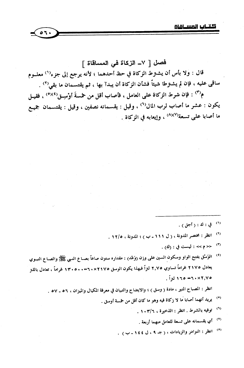 م: فإن شرط الزكاة على العامل, فأصاب أقل من خمسةً أوْسِق, فقيل يكون: عشر ما أصاب لرب المال, وقيل: يقسمانه نصفين, وقيل: يقتسمانه جميع ما أصابا على تسعة, وإيعابه في الزكاة.