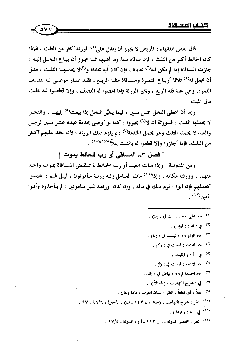 قال بعض الفقهاء: المريض لا يجوز أن يعقل على الورثة أكثر من الثلث, فإذا كان الحائط أكثر من الثلث, فإن ساقاه سنة وما أشبهه مما يجوز أن يباع النخل إليه: جازت المساقاة إذا لم يكن فيه محاباة, فإن كان فيه محاباة ولا يحملها الثلث, مثل أن يجعل له ثلاثة أرباع الثمرة ومساقاة مثله الربع, فقد صار موصى له بنصف الثمرة, وهي غلة فله الربع, ويخير الورثة فإما أمضوا له النصف, وإلا قطعوا له بثلث مال الميت.