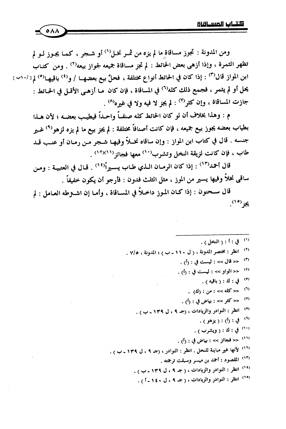 م: وهذا بخلاف أن لو كان الحائط كله صنفاً واحداً فيطيب بعضه؛ لأن هذا بطياب بعضه يجوز بيع جميعه, فإن كانت أصنافاً مختلفة: لم يجز بيع ما لم يزه لزهو غير جنسه. قال في كتاب ابن المواز: وإن ساقاه نخلاً وفيها شجر من رمان أو عنب قد طاب, فإن كانت لزيقة النخل وتشرب معها فجائز.