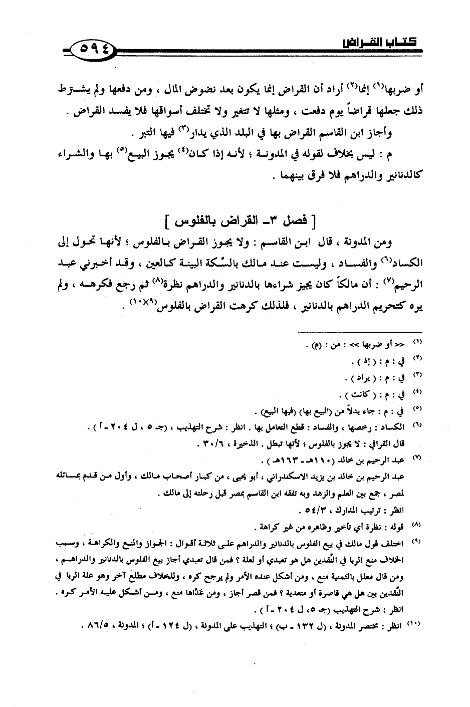 ومن المدونة, قال ابن القاسم: ولا يجوز القراض بالفلوس؛ لأنها تحول إلى الكساد والفساد, وليست عند مالك بالسَّكة البينة كالعين, وقد أخبرني عبد الرحيم: أن مالكاً كان يجيز شراءها بالدنانير والدراهم نظرة ثم رجع فكرهه, ولم يره كتحريم الدراهم بالدنانير, فلذلك كرهت القراض بالفلوس.