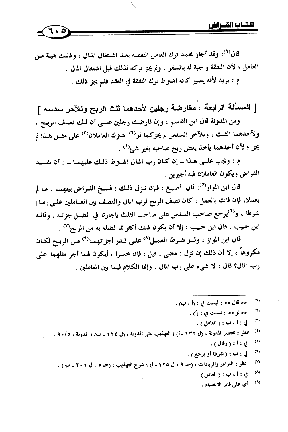 ومن المدونة قال ابن القاسم: وإن قارضت رجلين على أن لك نصف الربح, ولأحدهما الثلث, وللآخر السدس لم يجزكما لو اشترك العاملان على مثل هذا لم يجز؛ لأن أحدهما يأخذ بعض ربح صاحبه بغير شيء.