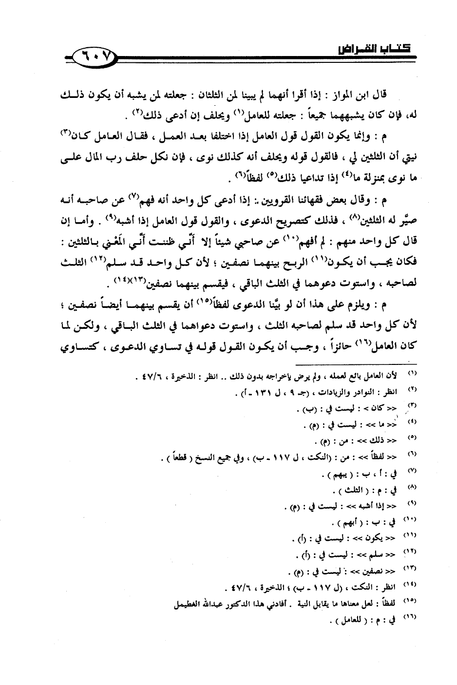 م: ويلزم على هذا أن لو بيَّنا الدعوى لفظاً أن يقسم بينهم أيضا نصفين؛ لأن كل واحد قد سلم لصاحبه الثلث, واستوت دعواهما في الثلث الباقي, ولكن لما كان العامل حائزاً, وجب أن يكون القول قوله في تساوي الدعوى, كتساوي