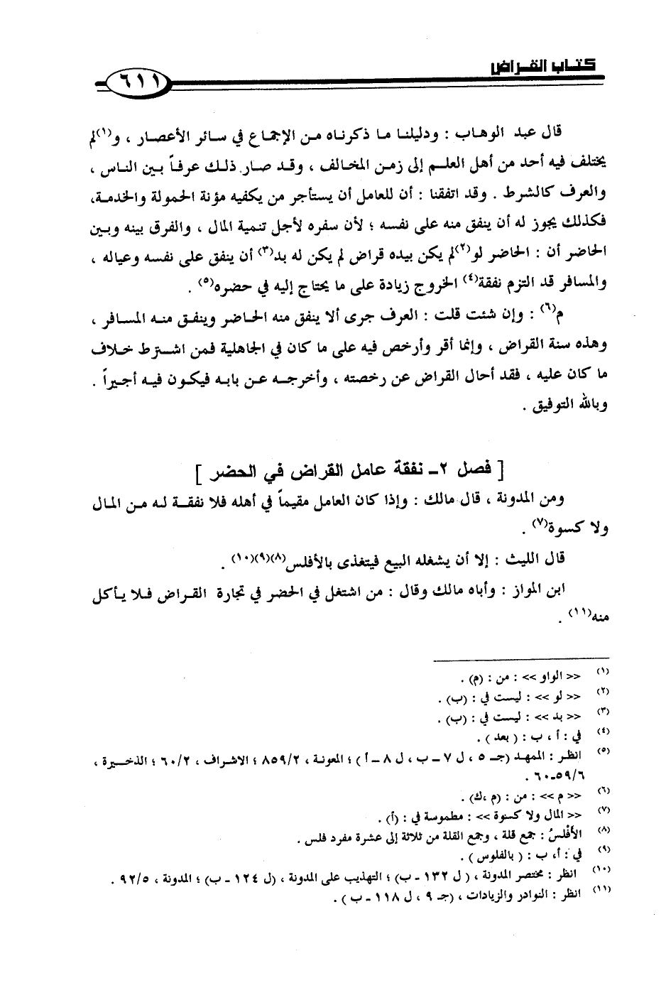 قال عبد الوهاب: ودليلنا ما ذكرنا ما ذكرناه من الإجماع في سائر الأعصار, ولم يختلف فيه أحد من أهل العلم إلى زمن المخالف, وقد صار ذلك عرفاً بين الناس, والعرف كالشرط. وقد اتفقنا: أن للعامل أن يستأجر من يكفيه مؤنه الحمولة والخدمة فكذلك يجوز أن ينفق منه على نفسه؛ لأن سفره لأجل تنمية المال, والفرق بينه وبين الحاضر أن: الحاضر لو لم يكن بيده قراض لم يكن له بد أن ينفق على نفسه وعياله, والمسافر قد التزم نفقة الخروج زيادة على ما يحتاج إليه في حضره.