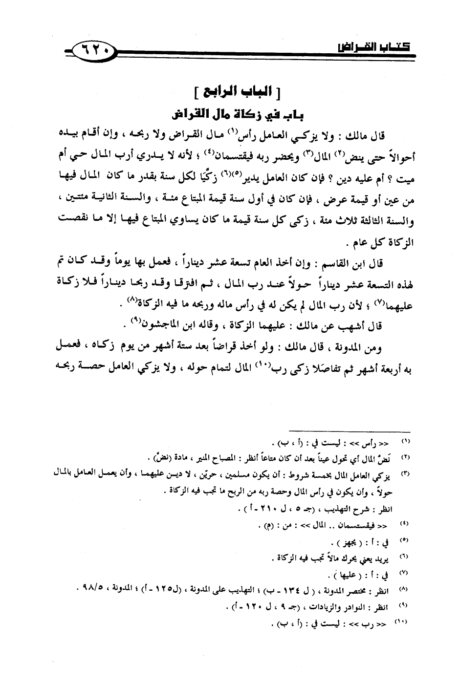 ومن المدونة, قال مالك: ولو أخذ قراضاً بعد ستة أشهر من يوم زكاه, فعمل به أربعة أشهر ثم تفاصَلا زكى رب المال لتمام حوله, ولا يزكي العامل حصة ربحه