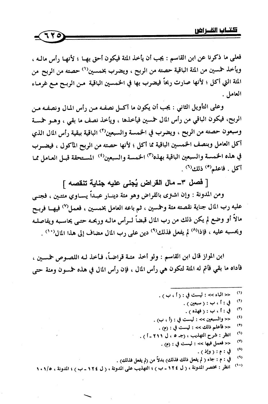 وعلى التأويل الثاني: يجب أن يكون ما أكل نصفه من رأس المال ونصفه من الربح, فيكون الباقي من رأس المال خمسين فيأخذها, ويأخذ نصف ما بقي, وهو خمسة وسبعون حصته من الربح, ويضرب في الخمسة والسبعين الباقية رأس المال الذي أكل العامل وبنصف الخمسين الباقية مما أكل؛ لأنها حصته من الربح المأكول, فيضرب في هذه الخمسة والسبعين بهذه الخمسة والسبعين المستحقة قبل العامل مما أكل. فاعلم ذلك.