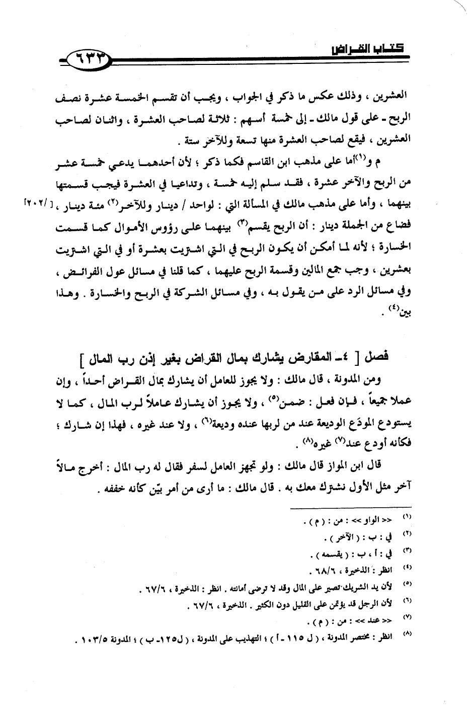 العشرين, وذلك عكس ما ذكر في الجواب, ويجب أن تقسم الخمسة عشرة نصف الربح -على قول مالك- إلى خمسة أسهم: ثلاثة لصاحب العشرة, واثنان لصاحب العشرين, فيقع لصاحب العشرين منها تسعة وللآخر ستة.