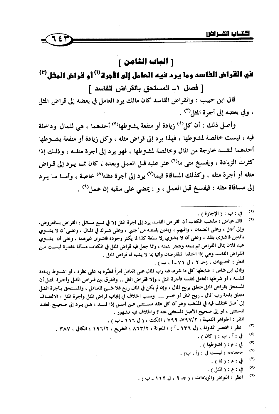 قال ابن حبيب: والقراض الفاسد كان مالك يرد العامل في بعضه إلى قراض المثل, وفي بعضه إلى أجرة المثل.