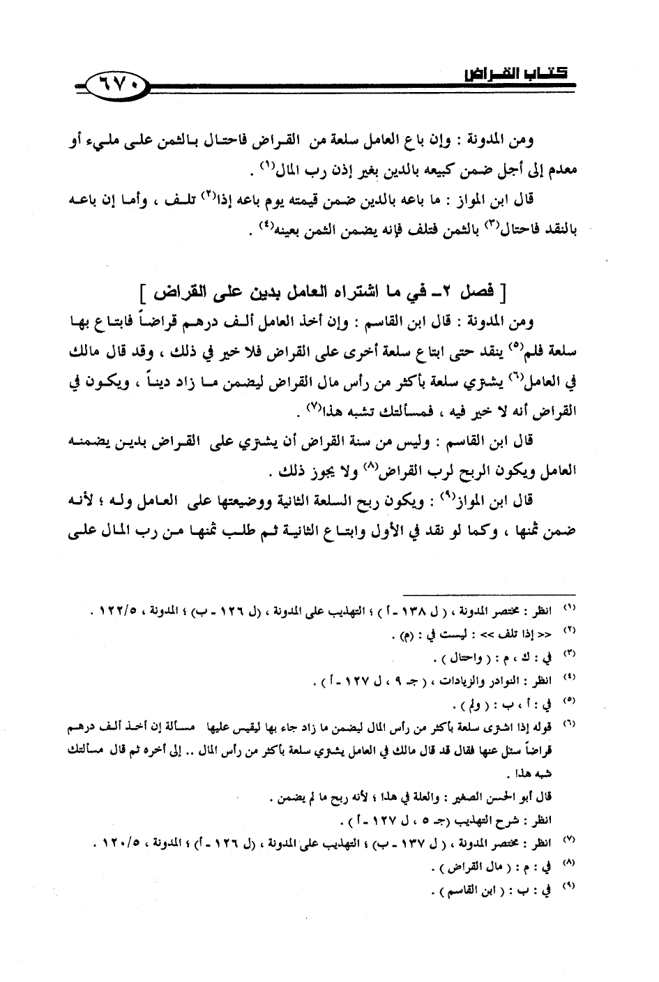 ومن المدونة: قال ابن القاسم: وإن أخذ العامل ألف درهم قراضاً فابتاع بها سلعة فلم ينقد حتى ابتاع سلعة أخرى على القراض فلا خير في ذلك, وقد قال مالك في العامل يشتري سلعة بأكثر من رأس مال القراض ليضمن ما زاد ديناً, ويكون في القراض أنه لا خير فيه, فمسألتك تشبه هذا.