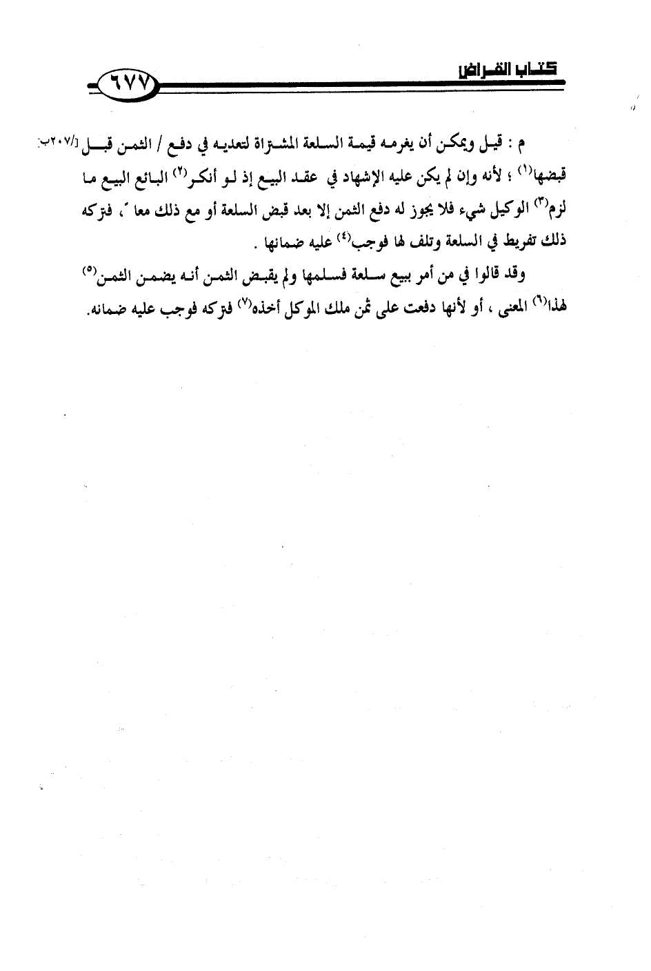 م: قيل ويمكن أن يغرمه قيمة السلعة المشتراه لتعديه في دفع/ الثمن قبل قبضها؛ لأنه وإن لم يكن عليه الإشهاد في عقد البيع إذ لو أنكر البائع البيع ما لزم الوكيل شيء فلا يجوز له دفع الثمن إلا بعد قبض السلعة أو مع ذلك معاً, فتركه ذلك تفريط في السلعة وتلف لها فوجب عليه ضمانها.