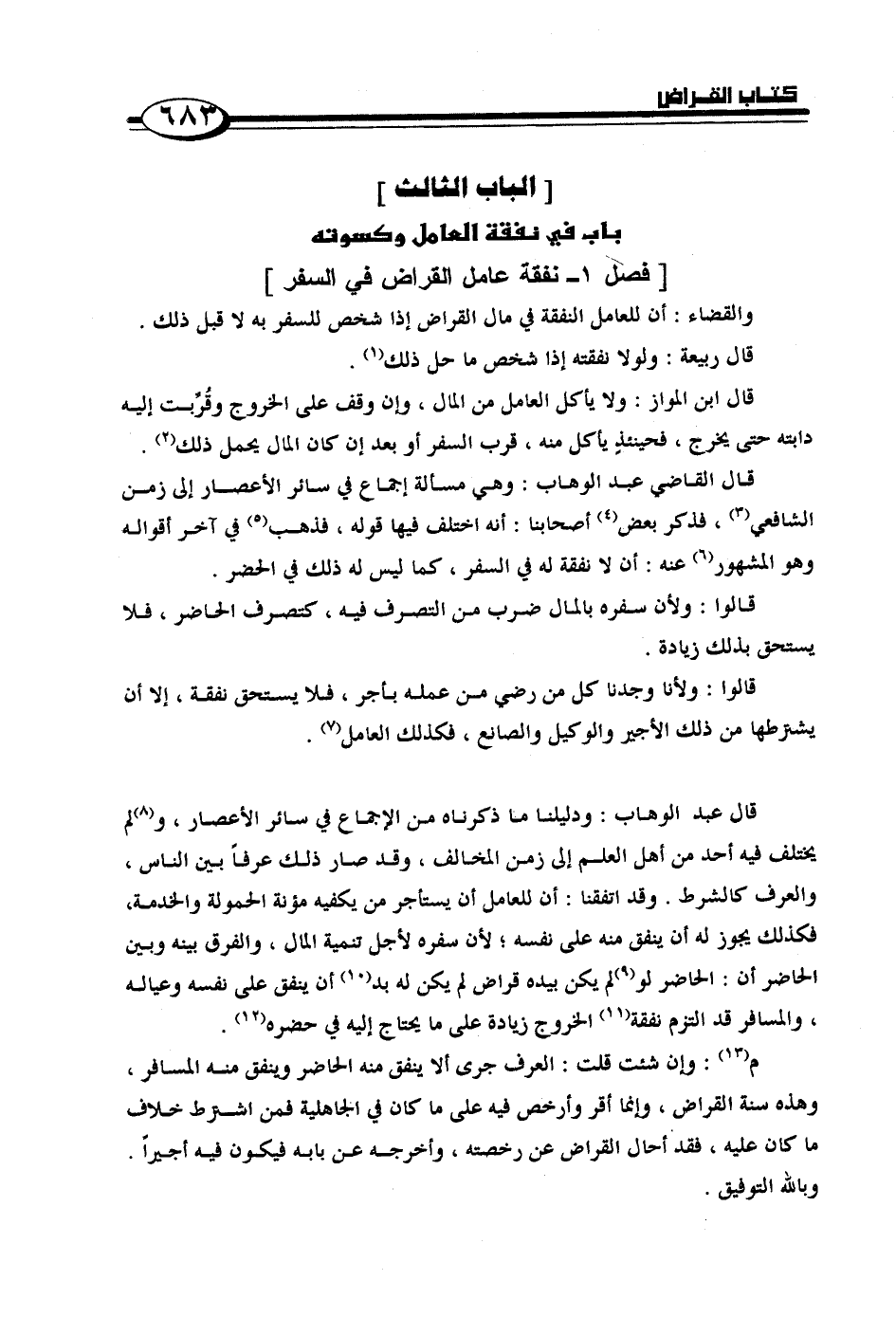قال عبد الوهاب: ودليلنا ما ذكرناه من الإجماع في سائر الأعصار, ولم يختلف فيه أحد من أهل العلم إلى زمن المخالف, وقد صار ذلك عرفاً بين الناس, والعرف كالشرط. وقد اتفقنا: أن للعامل أن يستأجر من يكفيه مؤنة الحمولة والخدمة, فكذلك يجوز له أن ينفق منه على نفسه؛ لأن سفره لأجل تنمية المال, والفرق بينه وبين الحاضر أن: الحاضر لو لم يكن بيده قراض لم يكن له بد أن ينفق على نفسه وعياله, والمسافر قد التزم نفقة الخروج زيادة على ما نختاج إليه في حضره.