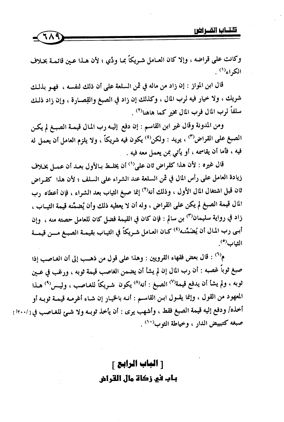 قال غيره: لأن هذا كقراض ثان على أن يخلط بالأول بعد أن عمل بخلاف زيادة العامل على رأس المال في ثمن السلعة عند الشراء على السلف؛ لأن هذا كقراض ثان قبل اشتغال المال الأول, وذلك أنه إنما صبغ الثياب بعد الشراء, فإن أعطاه رب المال قيمة الصبغ لم يكن على القراض, وله أن لا يعطيه ذلك وأن يُضمَّنه قيمة الثياب, زاد في رواية سليمان بن سالم: فإن كان في القيمة فضل كان للعامل حصته منه, وإن أبى رب المال أن يُضمَّنه كان العامل شريكاً في الثياب بقيمة الصبغ من قيمة الثياب.