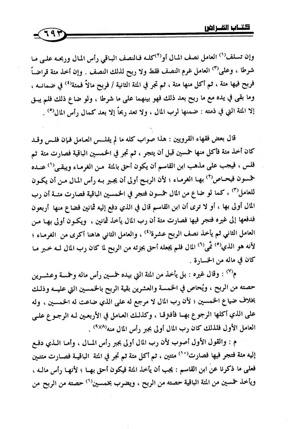م: وقال غيره: بل يأخذ من المئة التي بيده خمسين رأس ماله وخمسة وعشرين حصته من الربح, ويُحاص في الخمسة والعشرين بقية الربح بالخمسين التي عليه وذلك بخلاف ضياع الخمسين, لأن رب المال لا مرجع له على الذي ضاعت له الخمسين, وله على الذي أكلها الرجوع بها فافترقا, وكذلك العامل في الأربعين له الرجوع على العامل الأول فلذلك كان رب المال أولى بجبر رأس المال منه.