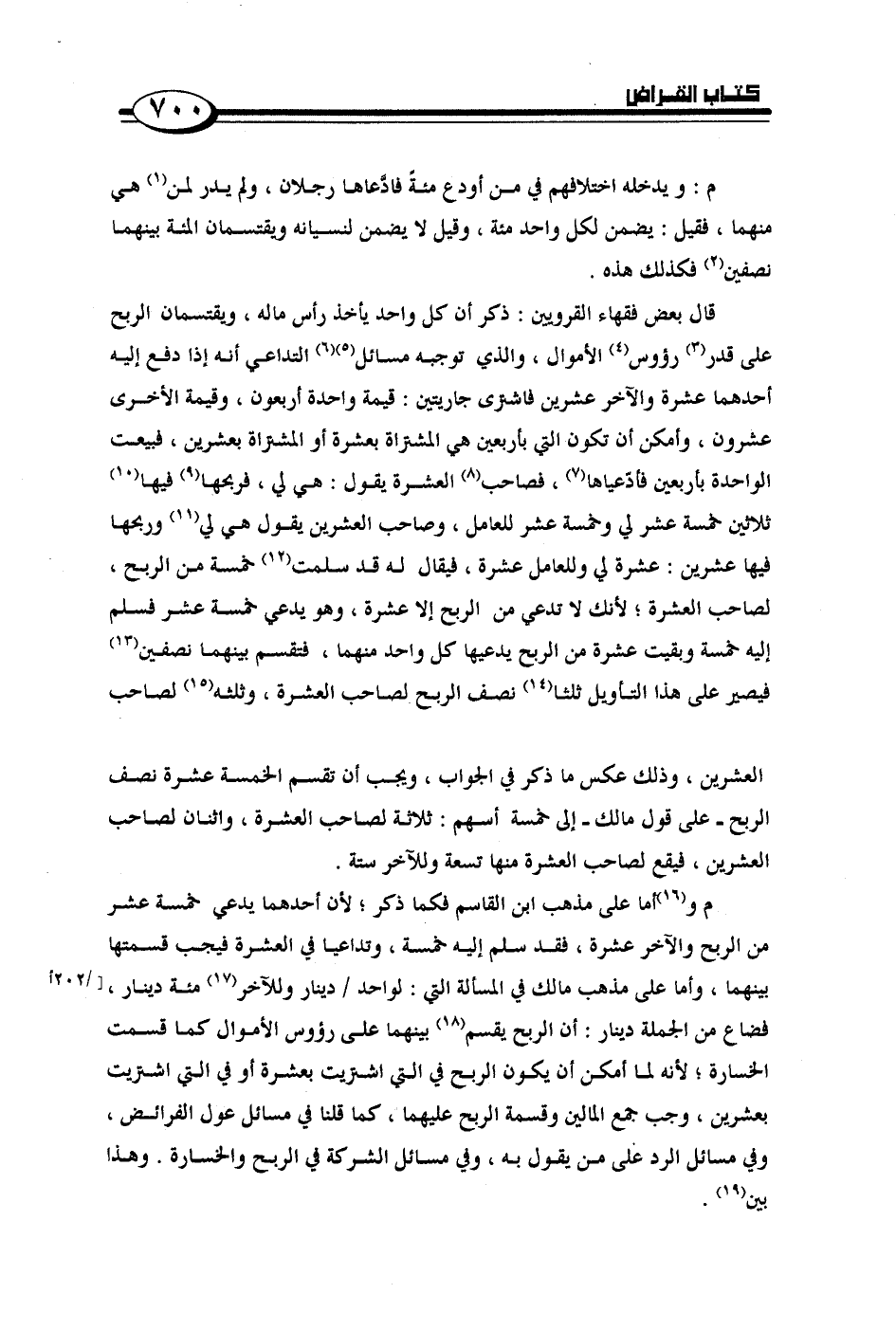 م وأما على مذهب ابن القاسم فكما ذكر؛ لأن أحدهما يدعي خمسة عشر من الربح والآخر عشرة, فقد سلم إليه خمسة, وتداعيا في العشرة فيجب قسمتها بينهما, وأما على مذهب مالك في المسألة التي: لواحد/ دينار وللآخر مئة دينار, فضاع من الجملة دينار: أن الربح يقسم بينهما على رؤوس الأموال كما قسمت الخسارة؛ لأنه لما أمكن أن يكون الربح في التي اشتريت بعشرة أو في التي اشتريت بعشرين, وجب جمع المالين وقسمة الربح عليهما, كما قلنا في مسائل عول الفرائض, وفي مسائل الرد على من يقول به, وفي مسائل الشركة في الربح والخسارة. وهذا بين.