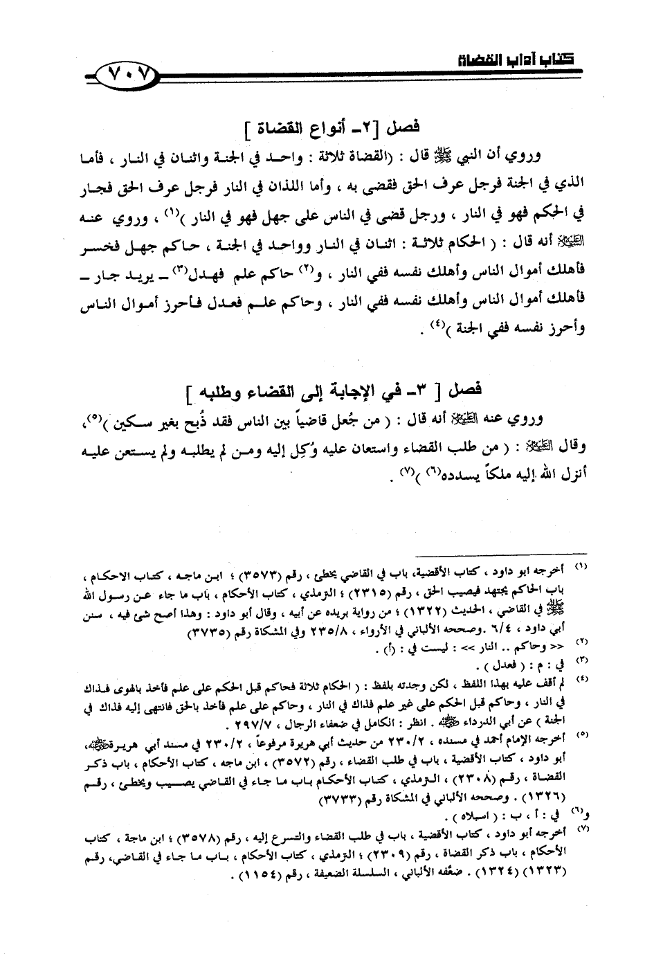 وروى أن النبي صلى الله عليه وسلم قال: «القضاة ثلاثة: واحد في الجنة واثنان في النار، فأما الذي في الجنة فرجل عرف الحق فقضى به، وأما اللذان في النار فرجل عرف الحق فجار في الحكم فهو في النار، ورجل قضى في الناس على جهل فهو في النار»، وروي عنه عليه السلام أنه قال: «الحكام ثلاثة: اثنان في النار وواحد في الجنة، حاكم جهل فخسر فأهلك أموال الناس وأهلك نفسه ففي النار، وحاكم علم فهدل - يريد جار - فأهلك أموال الناس وأهلك نفسه ففي النار، وحاكم علم فأحرز أموال الناس وأحرز نفسه ففي الجنة».
