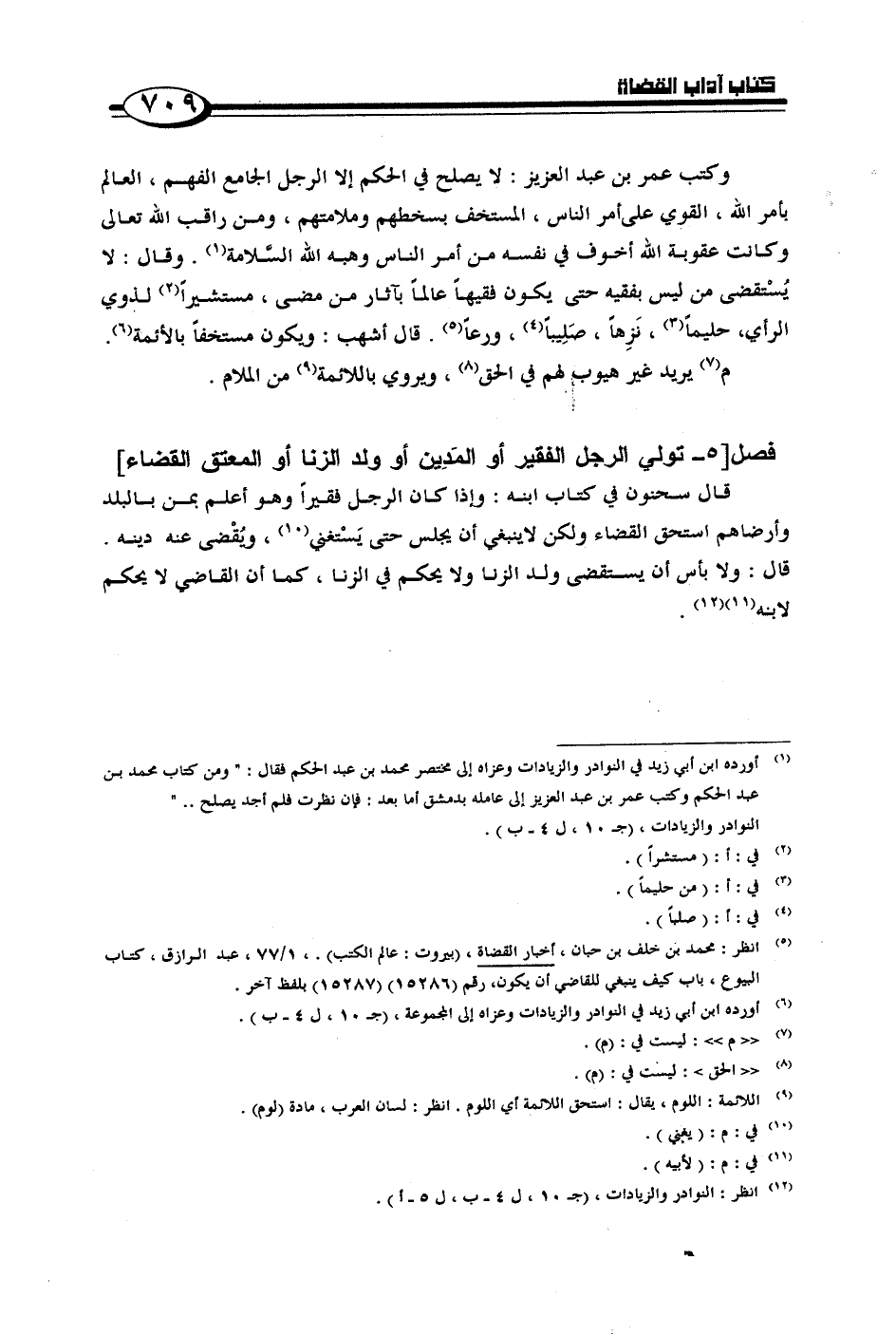 وكتب عمر بن عبد العزيز: لا يصلح في الحكم إلا الرجل الجامع الفهم، العالم بأمر الله، القوي على أمر الناس، المستخف بسخطهم وملامتهم، ومن راقب الله تعالى وكانت عقوبة الله أخوف في نفسه من أمر الناس وهبه الله السَّلامة. وقال لا يُسْتقضى من ليس بفقيه حتى يكون فقهياً عالماً بآثار من مضى، مستشيراً لذوي الرأي، حليماً، نزهاً، ورعاً. قال أشهب: ويكون مستخفاً بالأئمة.