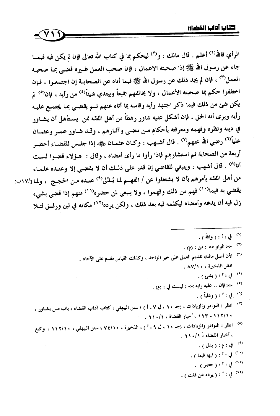 الرأي فالله أعلم، قال مالك: وليحكم بما في كتاب الله تعالى فإن لم يكن فيه فيما جاء عن رسول الله صلى الله عليه وسلم إذا صحبته الأعمال، فإن صحب العمل غيره قضى بما صحبه العمل، فإن لم يجد ذلك عن رسول الله صلى الله عليه وسلم فبما أتاه عن الصحابة إن اجتمعوا، فإن اختلفوا حكم بما صحبته الأعمال، ولا يخالفهم جميعاً ويبتدي شيئاً من رأيه، فإن لم يكن شيء من ذلك فيما ذكر اجتهد رأيه وقاسه بما أتاه عنهم ثم يقضي بما يجتمع عليه رأيه ويرى أنه الحق، فإن أشكل عليه شاور رهطاً من أهل الفقه ممن يستأهل أن يشاور في دينه ونظره وفهمه ومعرفته بأحكام من مضى وآثارهم، وقد شاور عمر وعثمان علياً رضي الله عنهم. قال أشهب: وكان عثمان رضي الله عنه إذا جلس للقضاء أحضر أربعة من الصحابة ثم استشارهم فإذا رأوا ما رأى أمضاه، وقال: هؤلاء قضوا ليست أنا. قال أشهب: وينبغي للقاضي إن قدر على ذلك أن لا يقضي إلا وعنده علماء من أهل الفقه يأمرهم بأن لا يشتغلوا عن / الفهم لما يُدْلي عنده من الحجج، ولما يقضي به فيما فهم من ذلك وفهموا، ولا ينبغي لمن حضره منهم إذا قضي بشيء زل فيه أن يدعه وأمضاه ليكلمه فيه بعد ذلك، ولكن يرده مكانه في لين ورفق لئلا