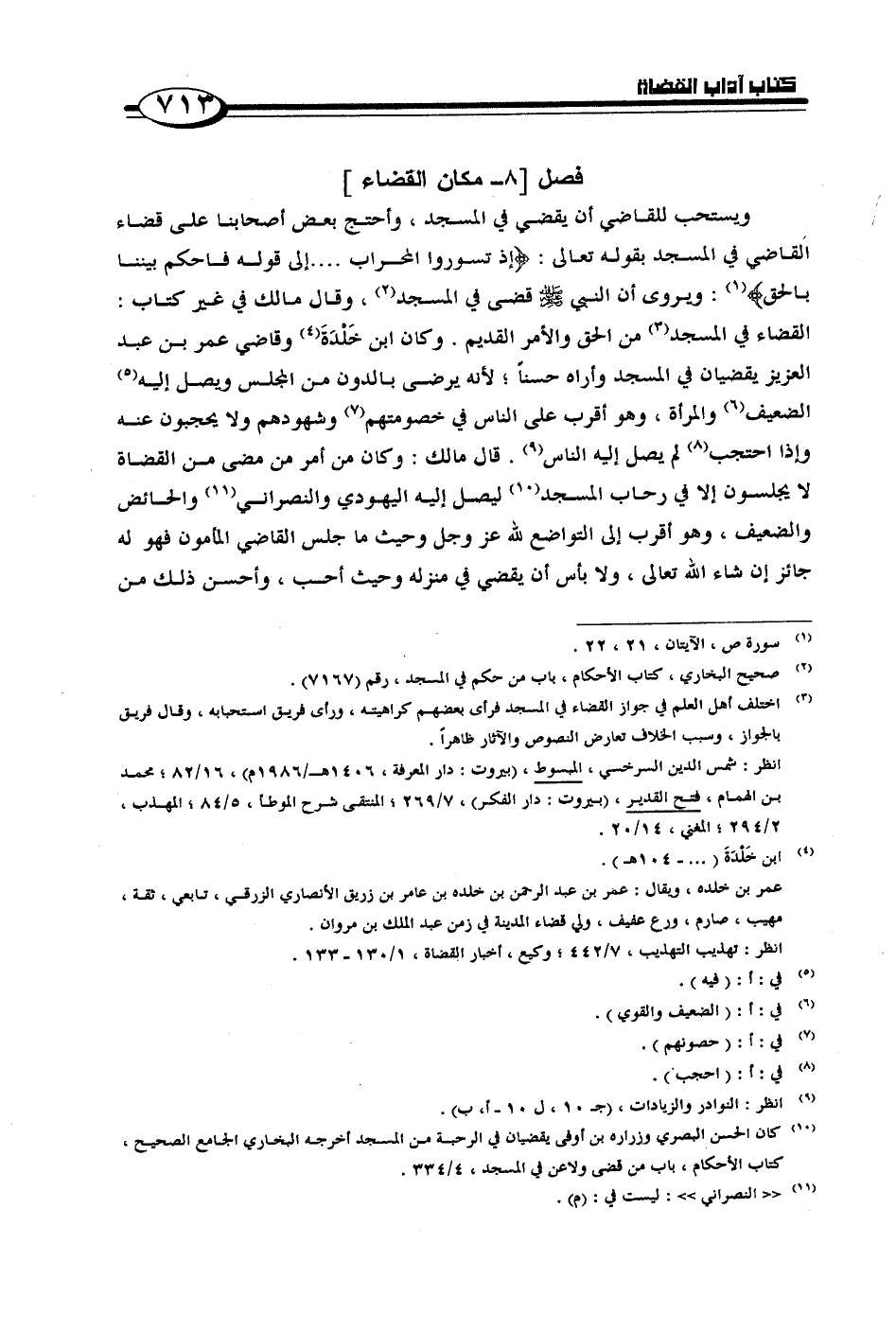 ويستحب للقاضي أن يقضي في المسجد، وأحتج بعض أصحابنا على قضاء القاضي في المسجد بقوله تعالى: {إِذْ تَسَوَّرُوا الْمِحْرَابَ إلى قوله فَاحْكُمْ بَيْنَنَا}: ويروى أن النبي صلى الله عليه وسلم قضى في المسجد، وقال مالك في غير كتاب: القضاء في المسجد من الحق والأمر القديم. وكان ابن خَلْدَةَ وقاضي عمر بن عبد العزيز يقضيان في المسجد وأراه حسناً؛ لأنه يرضى بالدون من المجلس ويصل إليه الضعيف والمرأة، وهو أقرب على الناس في خصومتهم وشهودهم ولا يحجبون عنه وإذا احتجب لم يصل إليه الناس. قال مالك: وكان من أمر من مضى من القضاة لا يجلسون إلا في رحاب المسجد ليصل إليه اليهودي والنصراني والحائض والضعيف، وهو أقرب إلى التواضع لله عز وجل وحيث ما جلس القاضي المأمون فهو له جائز إن شاء الله تعالى، ولا بأس أن يقضى في منزله وحيث أحب، وأحسن ذلك من
