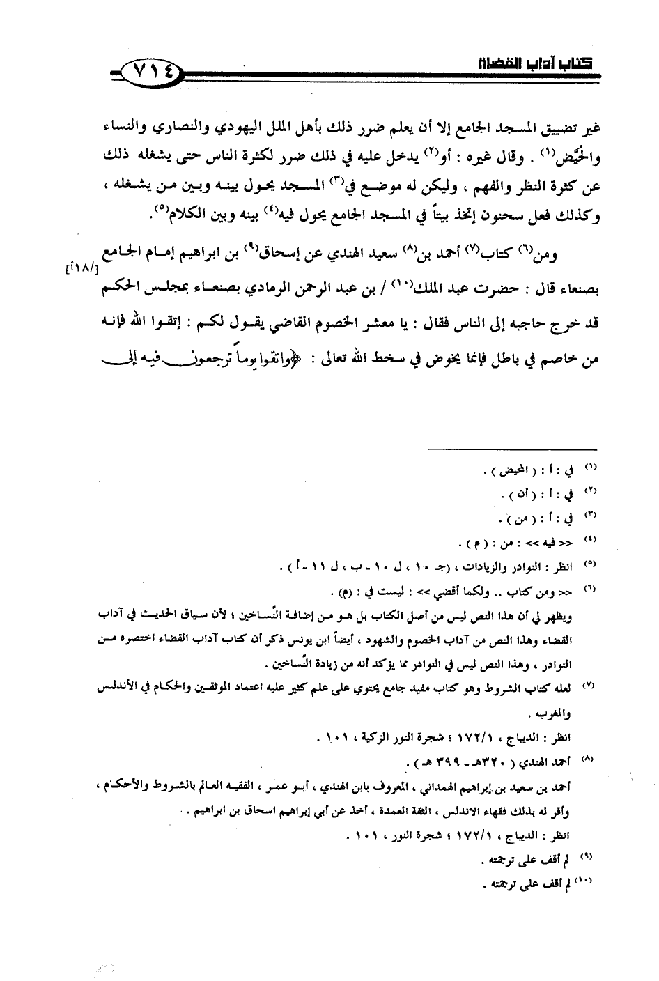 ومن كتاب أحمد بن سعيد الهندي عن إسحاق بن إبراهيم إمام الجامع بصنعاء قال: حضرت عبد الملك / بن عبد الرحمن الرمادي بصنعاء بمجلس الحكم قد خرج حاجيه إلى الناس فقال: يا معشر الخصوم القاضي يقول لكم: اتقوا الله فإنه من خاصم في باطل فإنما يخوض في سخط الله تعالى: {اتَّقُوا يَوْمًا تُرْجَعُونَ فِيهِ إِلَى